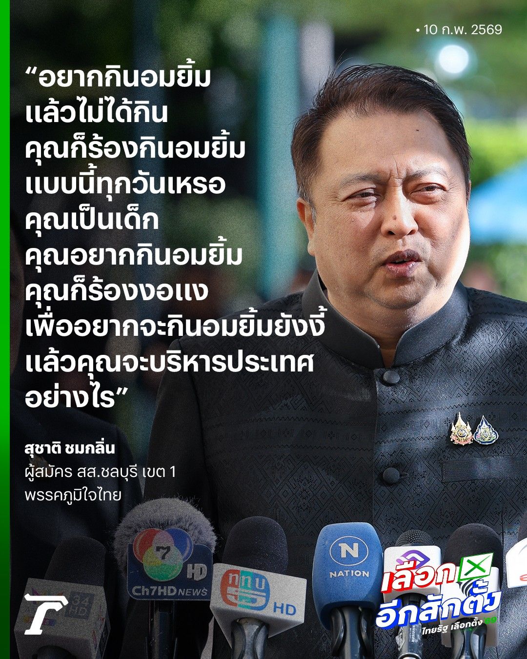 เมื่อเวลา 09.30 น. วันที่ 10 กุมภาพันธ์ 2569 นายสุชาติ ชมกลิ่น รองนายกรัฐมนตรีและรัฐมนตรีว่าการกระทรวงทรัพยากรธรรมชาติและสิ่งแวดล้อม ในฐานะผู้สมัครสมาชิกสภาผู้แทนราษฎร (สส.) ชลบุรี เขตเลือกตั้งที่ 1 พรรคภูมิใจไทย (ภท.) กล่าวที่ทำเนียบรัฐบาล ถึงกรณีมีการเรียกร้องให้นับคะแนนใหม่ใน จ.ชลุบรี เขตเลือกตั้งที่ 1 ว่า ตรงนี้ต้องแยกหน้าที่ก่อน หน้าที่ตนจบตั้งแต่ 18.00 น. วันที่ 7 กุมภาพันธ์ พอวันที่ 8 กุมภาพันธ์ ตื่นมาก็ไปเลือกตั้ง ที่เหลือทั้งหมดทุกพรรคการเมืองจะมีผู้สังเกตการณ์ที่จะเข้าไปทุกหน่วยเลือกตั้ง มีกล้องวิดีโอจับทุกหน่วยเพื่อจับพฤติกรรมของแต่ละพรรคการเมือง