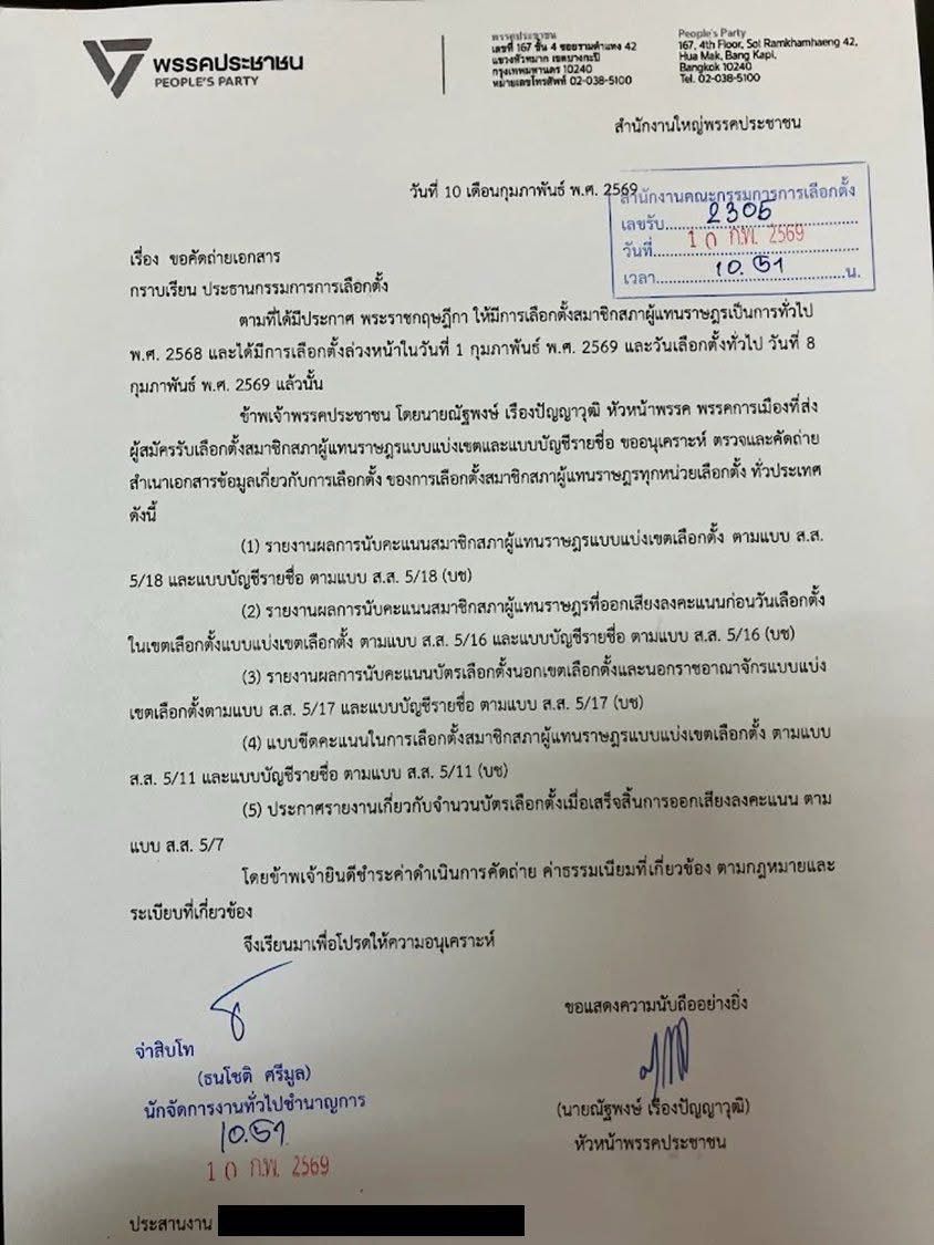 วันที่ 10 กุมภาพันธ์ 2569 นายกรุณพล เทียนสุวรรณ รองโฆษกพรรคประชาชน โพสต์ภาพหนังสือของพรรคประชาชน ลงนามโดยนายณัฐพงษ์ เรืองปัญญาวุฒิ หัวหน้าพรรคประชาชนถึงประธานคณะกรรมการการเลือกตั้ง สาระสำคัญเกี่ยวกับการขอคัดถ่ายเอกสาร โดยอ้างอิงการเลือกตั้งที่มีขึ้นในวันที่ 1 กุมภาพันธ์ และ 8 กุมภาพันธ์ 2569