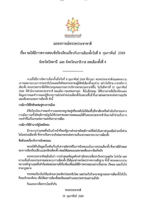 พรรคประชาชาติออกแถลงการณ์เรียกร้อง กกต. ตรวจสอบทุจริตผลการเลือกตั้ง สส. ปัตตานีและนราธิวาส เขต 4 ยืนยันพบความผิดปกติในการนับคะแนน เจ้าหน้าที่รัฐวางตัวไม่เป็นกลาง