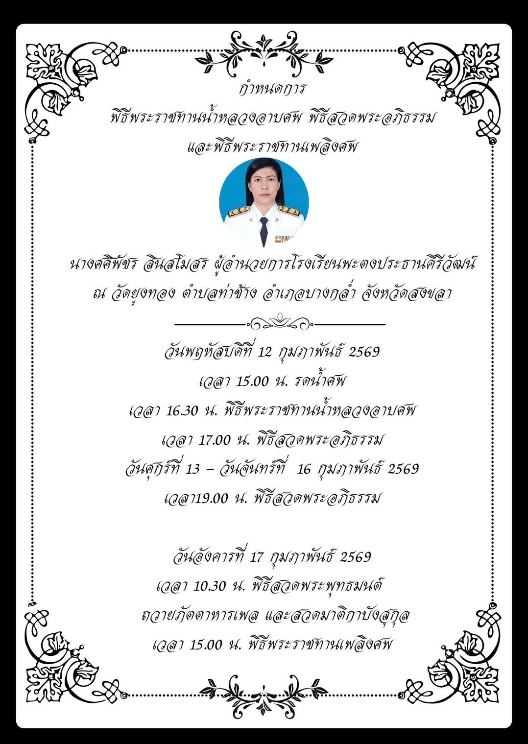 วันที่ 12 กุมภาพันธ์ 2569 นางนฤมล ภิญโญสินวัฒน์ รัฐมนตรีว่าการกระทรวงศึกษาธิการ มีกำหนดการเดินทางลงพื้นที่จังหวัดสงขลา เพื่อร่วมพิธีพระราชทานน้ำหลวงอาบศพ นางศศิพัชร สินสโมสร ผู้อำนวยการโรงเรียนพะตงประธานคีรีวัฒน์ ณ วัดยูงทอง ตำบลท่าข้าง อำเภอหาดใหญ่ พร้อมทั้งเยี่ยมให้กำลังใจผู้ได้รับผลกระทบจากเหตุคนร้ายใช้อาวุธปืนที่ชิงมาจากตำรวจบุกเข้าไปก่อเหตุในโรงเรียนพะตงประธานคีรีวัฒน์