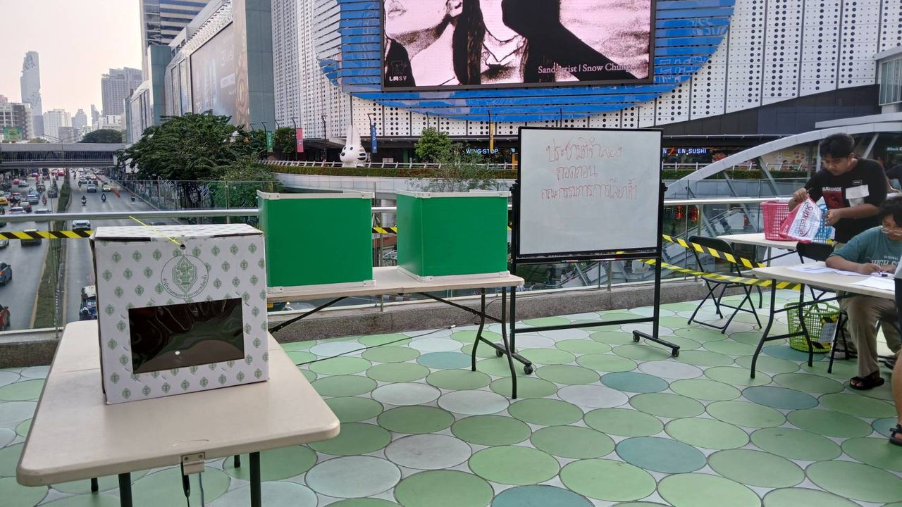 ภาคประชาชนจัดกิจกรรมเชิงสัญลักษณ์ ลงประชามติจำลอง “เห็นชอบสมควรถอดถอน กกต. หรือไม่” สกายวอล์กแยกปทุมวัน คนทยอยร่วมคึกคัก แถลงเรียกร้อง กกต. รับผิดชอบ หลังการเลือกตั้งส่อขัดต่อรัฐธรรมนูญ