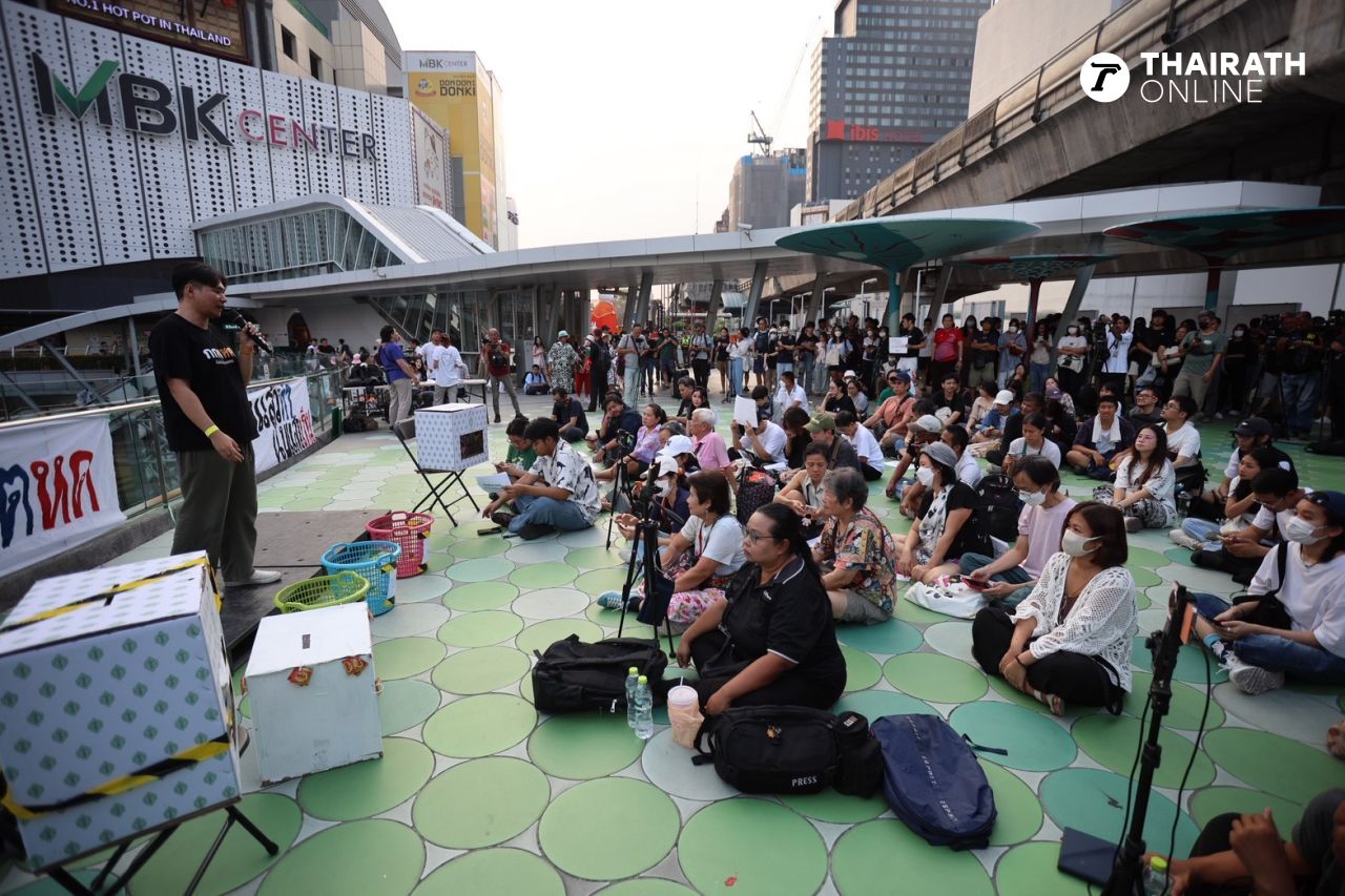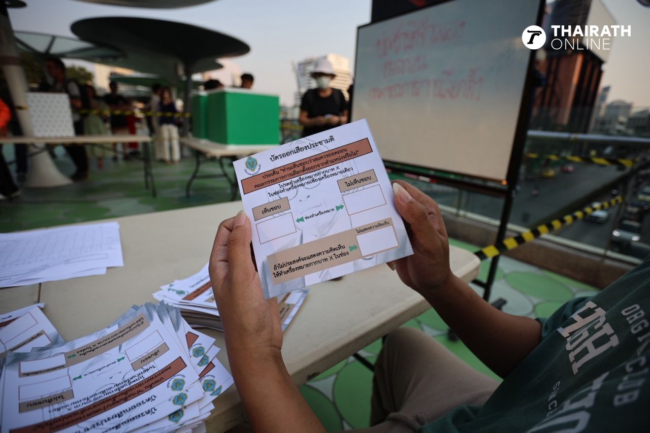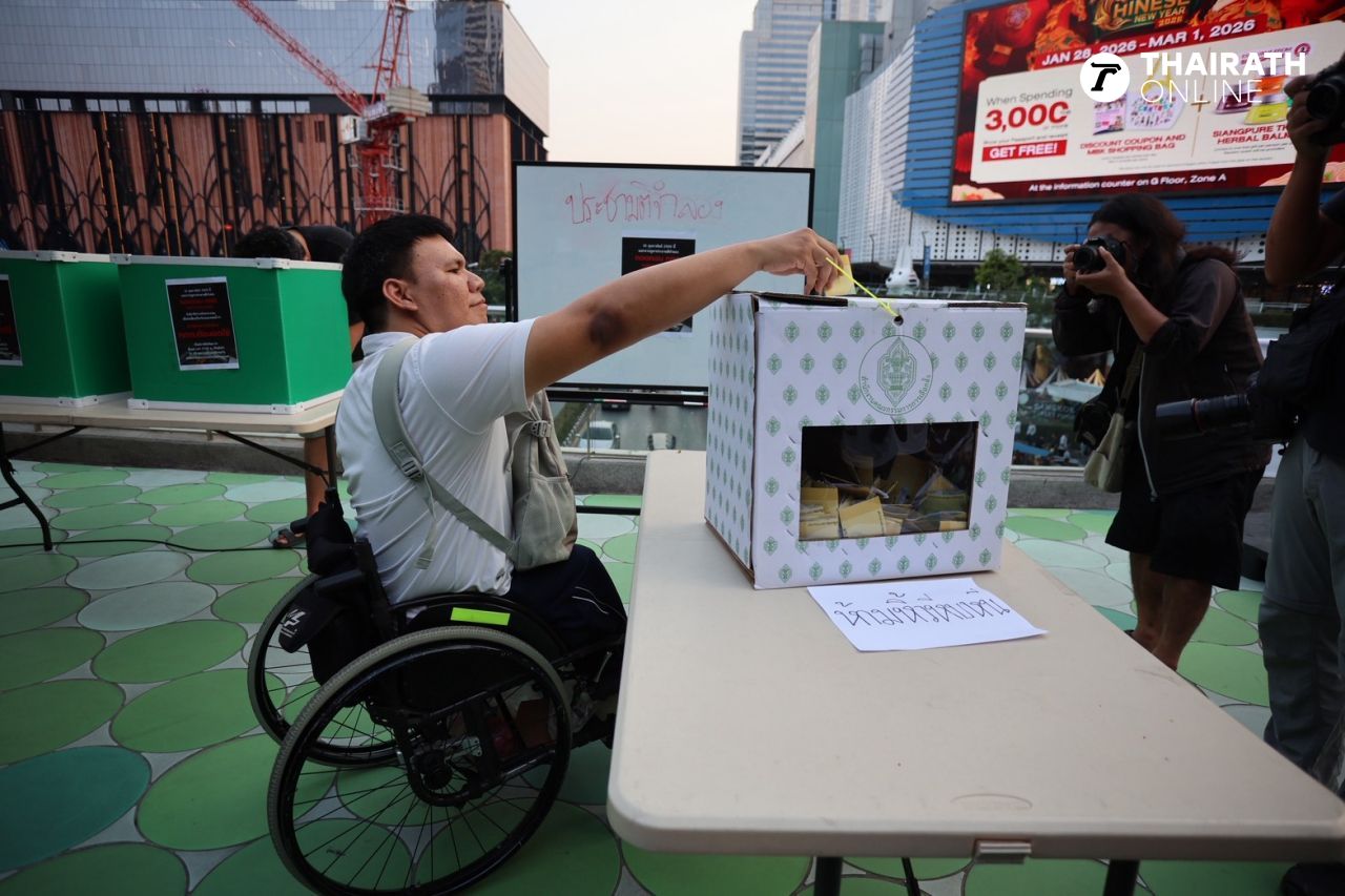 เมื่อเวลา 17.00 น. วันที่ 15 กุมภาพันธ์ 2569 ที่สกายวอล์กแยกปทุมวัน เครือข่ายนักศึกษา 9 สถาบัน ประกอบด้วย จุฬาลงกรณ์มหาวิทยาลัย มหาวิทยาลัยธรรมศาสตร์ มหาวิทยาลัยเกษตรศาสตร์ มหาวิทยาลัยขอนแก่น สถาบันเทคโนโลยีพระจอมเกล้าคุณทหารลาดกระบัง มหาวิทยาลัยเชียงใหม่ มหาวิทยาลัยแม่ฟ้าหลวง มหาวิทยาลัยรามคำแหง และมหาวิทยาลัยศรีนครินทรวิโรฒ นำโดยกลุ่มแนวร่วมธรรมศาสตร์และการชุมนุม จัดกิจกรรมเชิงสัญลักษณ์ในการจัดการลงประชามติจำลองประเด็นการถอดถอน กกต. โดยมีกลุ่มประชาชนผู้สนับสนุนจำนวนมากต่างทยอยมาต่อแถวเพื่อเข้าร่วมกิจกรรมการออกเสียงลงประชามติจำลองดังกล่าวกันอย่างคึกคัก