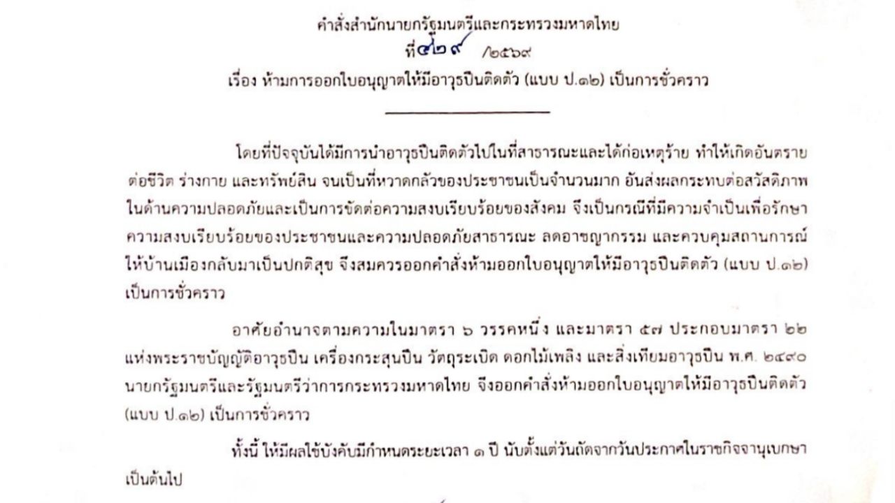 วันที่ 20 กุมภาพันธ์ 2569 นายอนุทิน ชาญวีรกูล นายกรัฐมนตรี และ รัฐมนตรีว่าการกระทรวงมหาดไทย ได้ลงนามในคำสั่งสำนักนายกรัฐมนตรีและกระทรวงมหาดไทย ที่ 429/2569 ลงวันที่ 19 กุมภาพันธ์ 2569 เรื่อง ห้ามการออกใบอนุญาตให้มีอาวุธปืนติดตัว (แบบ ป.12) เป็นการชั่วคราว เพื่อแก้ไขปัญหาวิกฤตความปลอดภัยในพื้นที่สาธารณะ