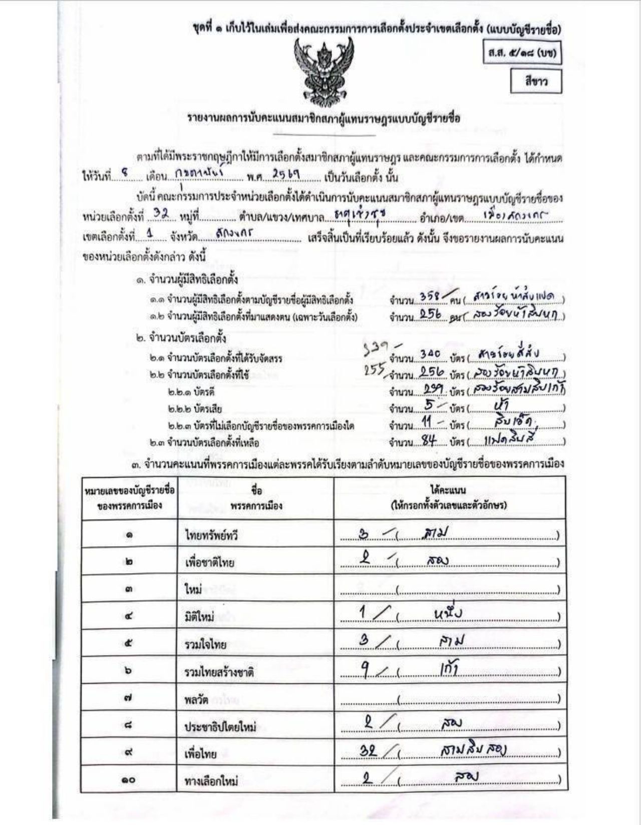 ผลการนับคะแนนใหม่ สส. บัญชีรายชื่อ สกลนคร เขต 1 หน่วยเลือกตั้งที่ 32 ผลคะแนนครบถ้วน คาดเจ้าหน้าที่ลืมขีดตามที่ขานคะแนน