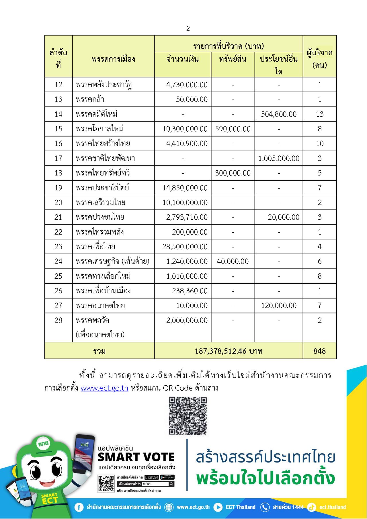 2. พรรคประชาชน (ถิ่นกาขาวชาววิไล) ผู้บริจาค 580 คน จำนวนเงิน 7,937,942.46 บาท และมีประโยชน์อื่นใด 1,524,900 บาท