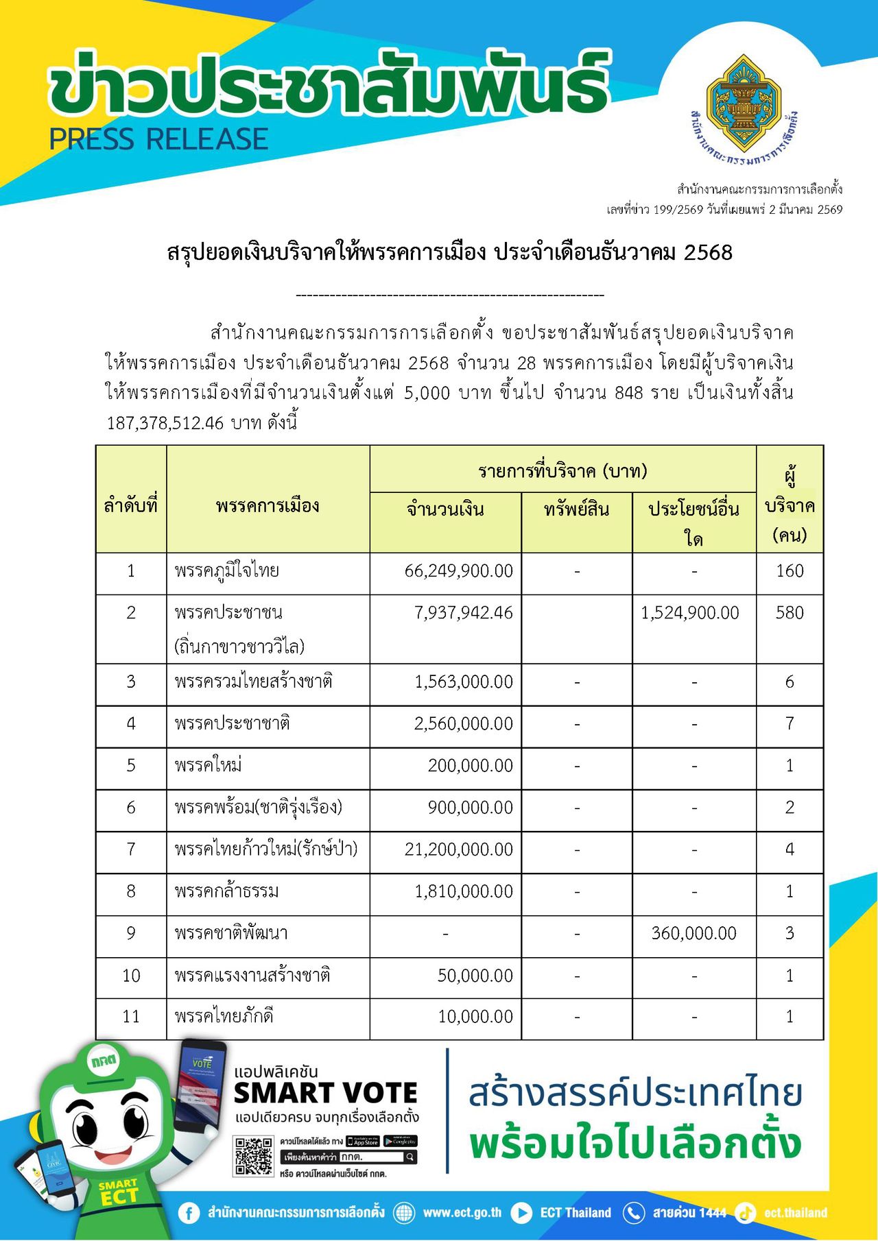 วันที่ 2 มีนาคม 2569 สำนักงานคณะกรรมการการเลือกตั้ง หรือ กกต. สรุปยอดเงินบริจาคให้พรรคการเมือง ประจำเดือนธันวาคม 2568 จำนวน 28 พรรคการเมือง โดยมีผู้บริจาคเงินให้พรรคการเมืองที่มีจำนวนเงินตั้งแต่ 5,000 บาท ขึ้นไป จำนวน 848 ราย เป็นเงินทั้งสิ้น 187,378,512.46 บาท ดังนี้