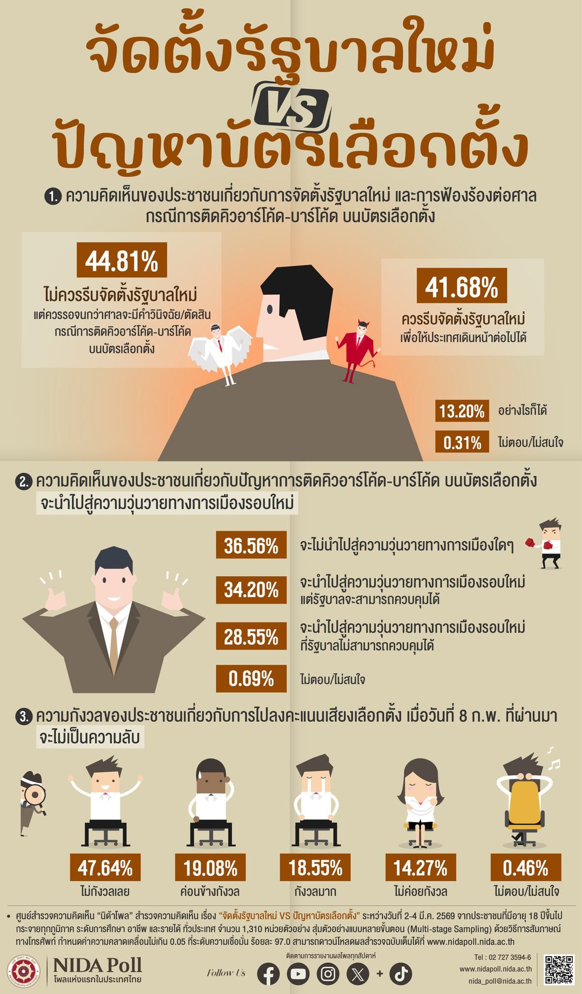 วันที่ 8 มีนาคม 2569 ศูนย์สำรวจความคิดเห็น “นิด้าโพล” สถาบันบัณฑิตพัฒนบริหารศาสตร์ (นิด้า) เปิดเผยผลการสำรวจ เรื่อง “จัดตั้งรัฐบาลใหม่ VS. ปัญหาบัตรเลือกตั้ง” ทำการสำรวจระหว่างวันที่ 2-4 มีนาคม 2569 จากประชาชนที่มีอายุ 18 ปีขึ้นไป กระจายทุกภูมิภาค ระดับการศึกษา อาชีพ และรายได้ ทั่วประเทศ รวมจำนวนทั้งสิ้น 1,310 หน่วยตัวอย่าง เกี่ยวกับความคิดเห็นของประชาชนต่อประเด็นการจัดตั้งรัฐบาลใหม่และปัญหาบัตรเลือกตั้งหลังการเลือกตั้ง การสำรวจอาศัยการสุ่มตัวอย่างโดยใช้ความน่าจะเป็นจากบัญชีรายชื่อฐานข้อมูลตัวอย่างหลัก (Master Sample) ของ “นิด้าโพล” สุ่มตัวอย่างแบบหลายขั้นตอน (Multi-stage Sampling) เก็บข้อมูลด้วยวิธีการสัมภาษณ์ทางโทรศัพท์ โดยกำหนดค่าความคลาดเคลื่อนไม่เกิน 0.05 ที่ระดับความเชื่อมั่น ร้อยละ 97.0