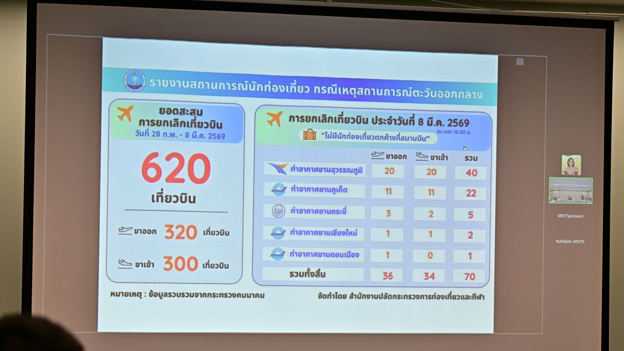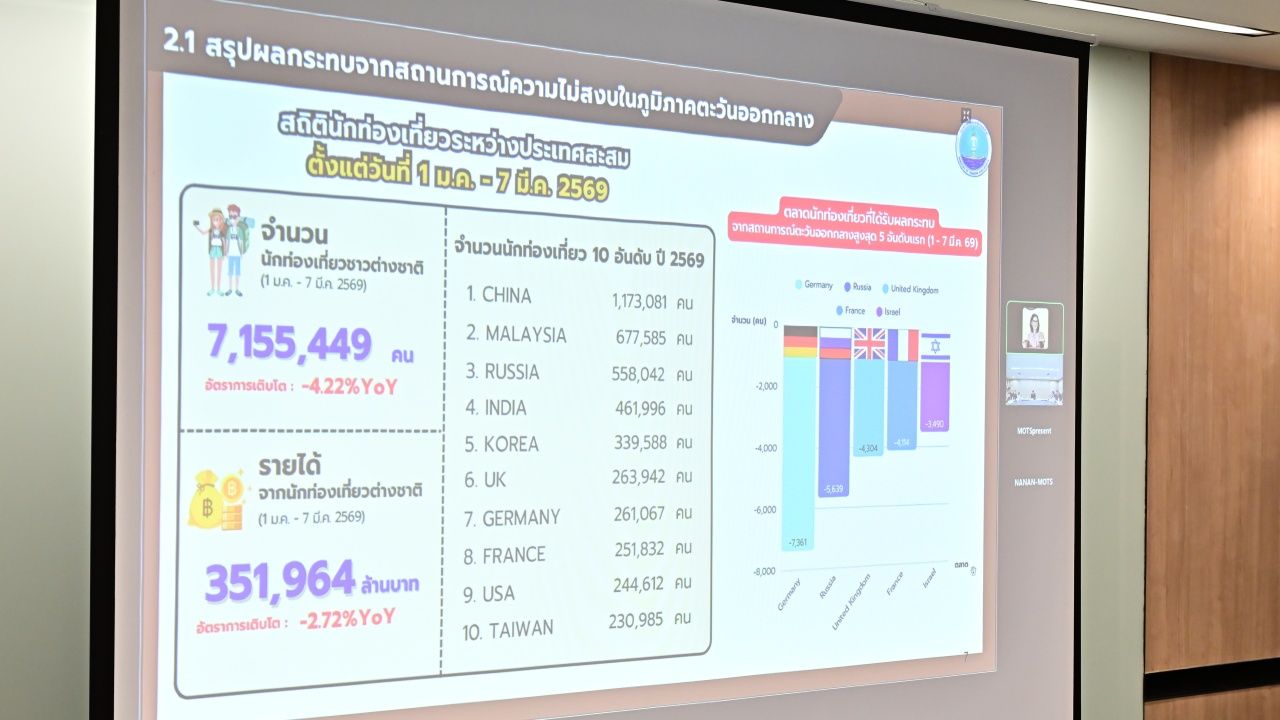 ที่ประชุมได้รับรายงานภาพรวมสถานการณ์การท่องเที่ยวระหว่างประเทศ โดยในช่วงเดือนมกราคม–กุมภาพันธ์ 2569 ประเทศไทยมีนักท่องเที่ยวต่างชาติเดินทางเข้ามากว่า 6.54 ล้านคน ลดลงเล็กน้อยจากช่วงเดียวกันของปีก่อน ขณะที่รายได้จากการท่องเที่ยวสะสมกว่า 3.2 แสนล้านบาท ทั้งนี้ ตลาดที่ได้รับผลกระทบจากสถานการณ์ความไม่สงบในภูมิภาคตะวันออกกลางและเส้นทางการบินที่เกี่ยวข้องมีแนวโน้มชะลอตัว โดยเฉพาะนักท่องเที่ยวจากยุโรปและตะวันออกกลางบางส่วน