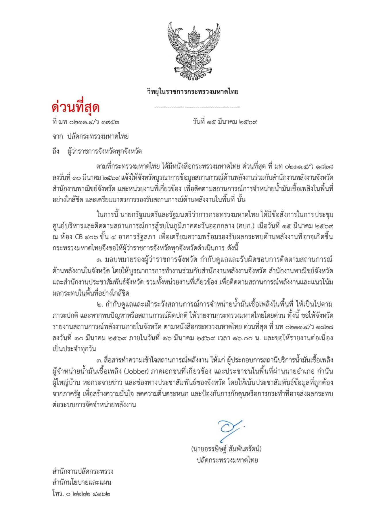 ปลัดมหาดไทย สั่งการด่วน ผวจ. ทั่วประเทศ เดินหน้าสร้างความเชื่อมั่น ลดความตื่นตระหนก และป้องกันการกระทำที่ส่งผลกระทบต่อระบบจำหน่ายพลังงานในพื้นที่