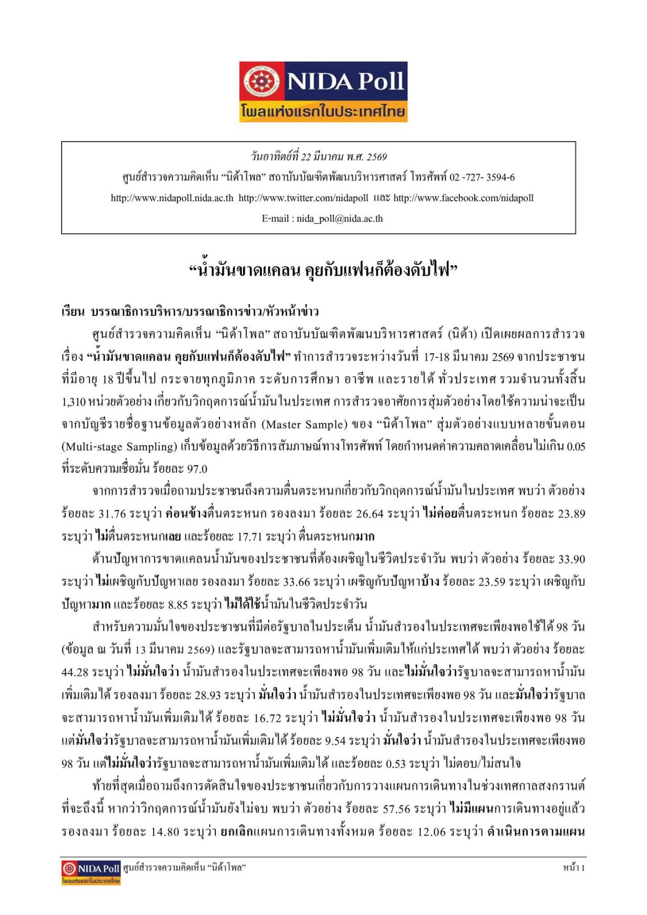วันที่ 22 มีนาคม 2569 ศูนย์สำรวจความคิดเห็น “นิด้าโพล” สถาบันบัณฑิตพัฒนบริหารศาสตร์ (นิด้า) เปิดเผยผลการสำรวจเรื่อง “น้ำมันขาดแคลน คุยกับแฟนก็ต้องดับไฟ” ทำการสำรวจระหว่างวันที่ 17-18 มีนาคม 2569 จากประชาชนที่มีอายุ 18 ปีขึ้นไป กระจายทุกภูมิภาค รวมจำนวนทั้งสิ้น 1,310 หน่วยตัวอย่าง เกี่ยวกับวิกฤตการณ์น้ำมันในประเทศ