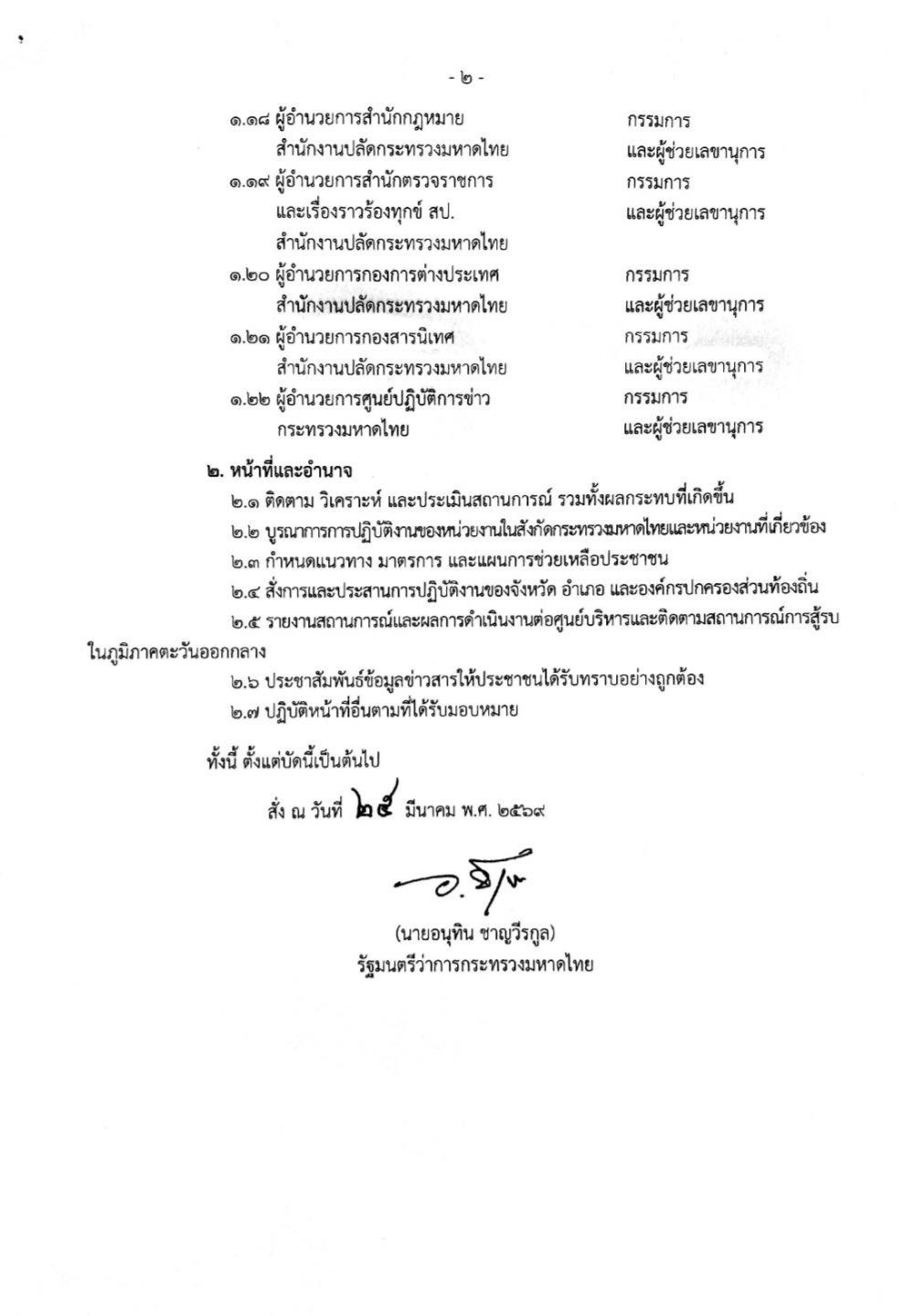 วันที่ 27 มีนาคม 2569 นายอรรษิษฐ์ สัมพันธรัตน์ ปลัดกระทรวงมหาดไทย เปิดเผยว่า นายอนุทิน ชาญวีรกูล นายกรัฐมนตรีและรัฐมนตรีว่าการกระทรวงมหาดไทย ลงนามคำสั่งกระทรวงมหาดไทย ที่ 736/2569 ลงวันที่ 25 มีนาคม 2569 เรื่อง จัดตั้งศูนย์บริหารและติดตามสถานการณ์การสู้รบในภูมิภาคตะวันออกกลาง (ศบก.) ของกระทรวงมหาดไทย