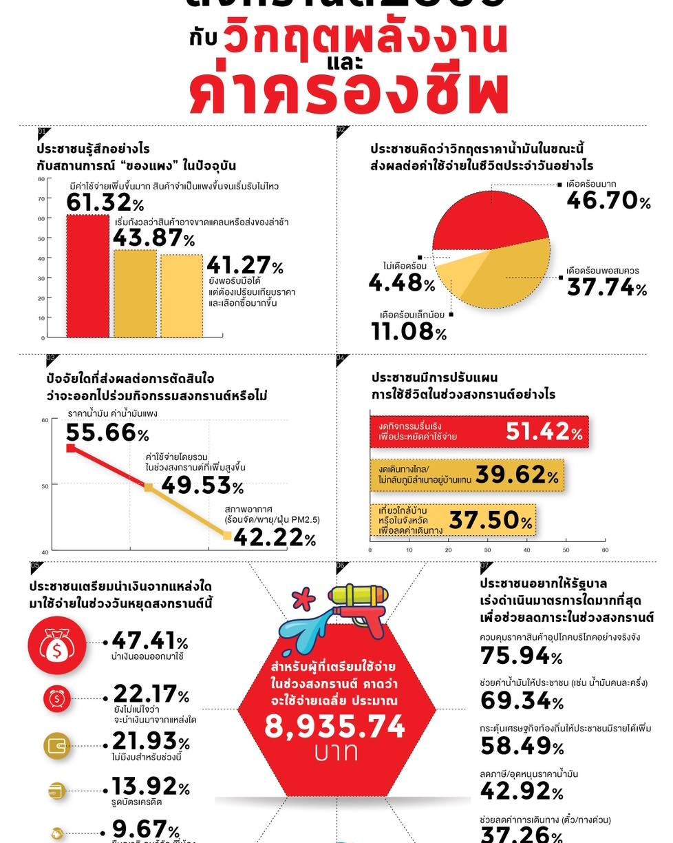 นอกจากนี้ ผลโพลยังสะท้อนให้เห็นว่าค่าน้ำมันแพงมีผลต่อการตัดสินใจออกไปร่วมกิจกรรมสงกรานต์ โดยประชาชนส่วนใหญ่คิดว่าจะงดกิจกรรมรื่นเริงเพื่อประหยัดค่าใช้จ่าย ซึ่งหากเป็นไปตามผลโพลก็อาจส่งผลกระทบต่อเศรษฐกิจของประเทศในภาพรวม เพราะตามปกติช่วงเทศกาลสงกรานต์ถือเป็นช่วงที่ประชาชนจับจ่ายใช้สอยอย่างเต็มที่ แหล่งเงินที่ประชาชนส่วนใหญ่จะนำมาใช้จ่ายในช่วงวันหยุดสงกรานต์นี้คือเงินออม โดยผลโพลคาดว่าจะใช้จ่ายเฉลี่ยประมาณ 8,935.74 บาท ซึ่งเงินจำนวนนี้อาจพอช่วยกระตุ้นเศรษฐกิจได้ในระดับหนึ่ง ท้ายที่สุด การควบคุมราคาสินค้าอุปโภคบริโภค และช่วยเหลือราคาน้ำมัน เป็นสิ่งที่ประชาชนส่วนใหญ่ต้องการ ความคาดหวังจึงตกไปอยู่ที่รัฐบาลว่าจะออกมาตรการต่างๆ ที่สามารถสนองความต้องการของประชาชนในเรื่องนี้ได้เพียงใด.