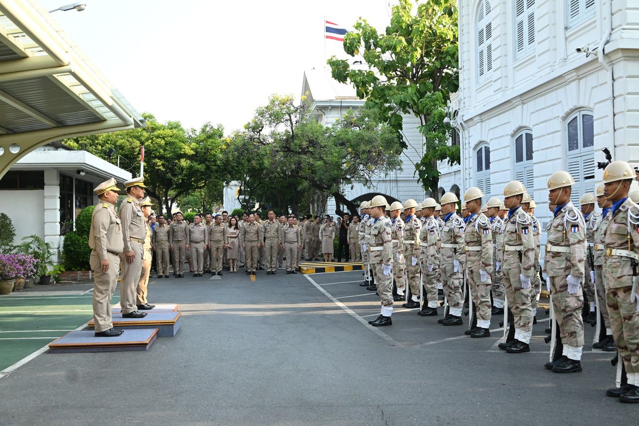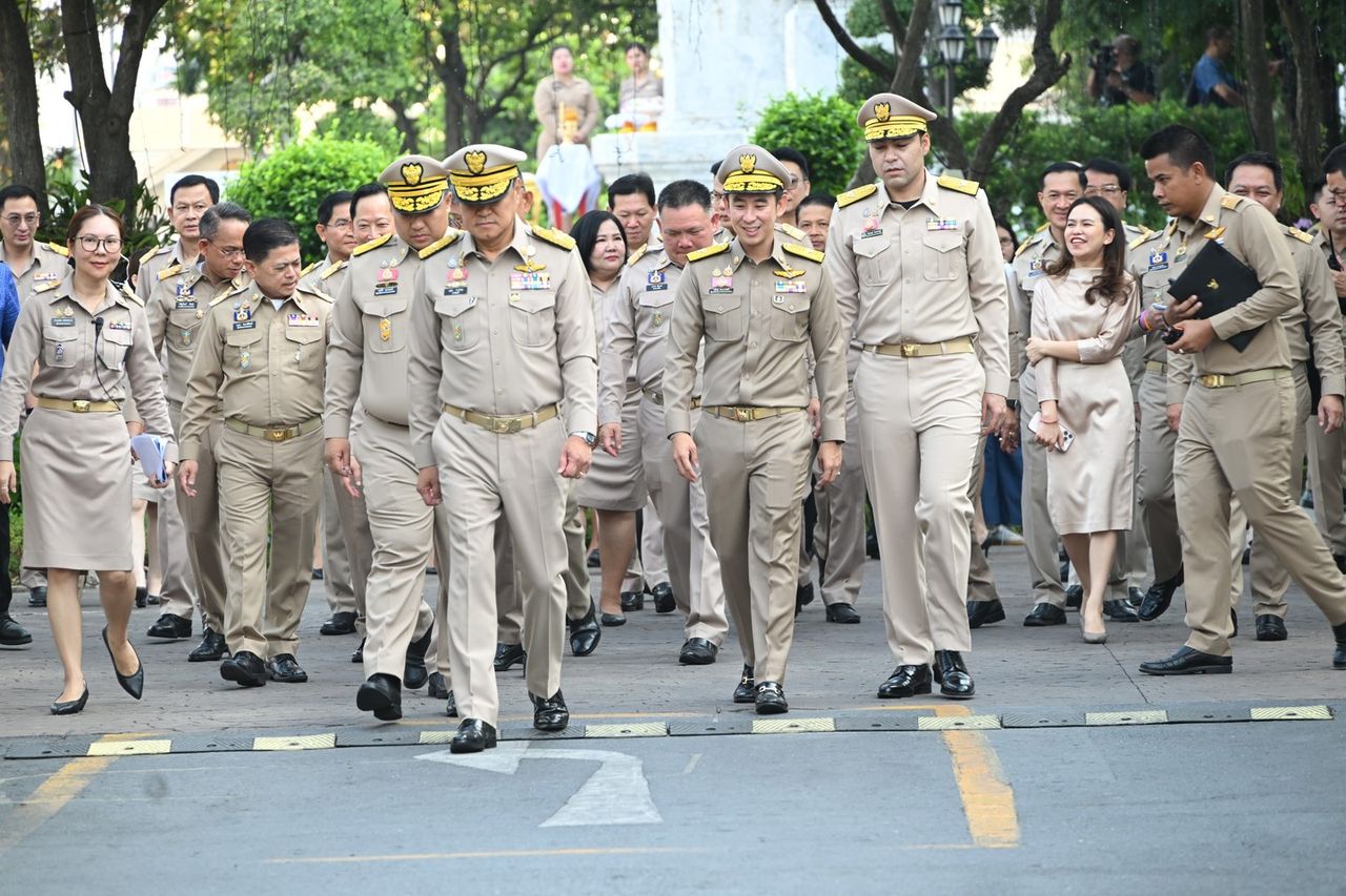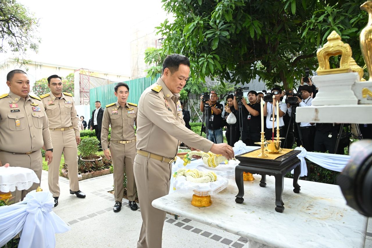 เมื่อรถของนายกรัฐมนตรีมาถึง พลแตรกองบัญชาการกองอาสารักษาดินแดนได้ให้สัญญาณ จากนั้นนายกรัฐมนตรี พร้อมด้วยรัฐมนตรีช่วยว่าการกระทรวงมหาดไทย เข้าสักการะพระพุทธมหานวนาคปฏิมากร ณ หอพระนาคปรก สวนสิรินธราภิรมย์ ใจกลางศาลาว่าการกระทรวงมหาดไทย ก่อนรับการแสดงความเคารพในฐานะผู้บัญชาการกองอาสารักษาดินแดน และรองผู้บัญชาการกองอาสารักษาดินแดนโดยกองเกียรติยศ กองอาสารักษาดินแดน (อส.) กระทรวงมหาดไทย แล้วสักการะศาลพระชัยมงคล ศาลพระกาฬไชยศรี พระอนุสาวรีย์สมเด็จฯ กรมพระยาดำรงราชานุภาพ องค์ปฐมเสนาบดีกระทรวงมหาดไทย แล้วเดินขึ้นบันไดโถงกลางเพื่อสักการะพระรูปสมเด็จฯ กรมพระยาดำรงราชานุภาพ และเดินเข้าสู่ห้องรับรองเพื่อสักการะพระรูปหล่อสมเด็จฯ กรมพระยาดำรงราชานุภาพ และถวายราชสักการะพระบรมรูป พระบาทสมเด็จพระจอมเกล้าเจ้าอยู่หัว พระสยามเทวมหามกุฏวิทยมหาราช และพระบรมรูปพระบาทสมเด็จพระจุลจอมเกล้าเจ้าอยู่หัว ณ ห้องรับรองรัฐมนตรีว่าการกระทรวงมหาดไทย