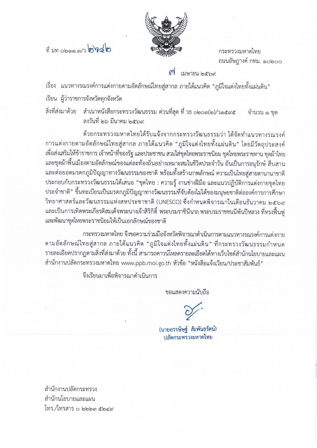 ปลัด มท. แจ้งผู้ว่าราชการจังหวัดทั่วประเทศ ขับเคลื่อนแนวคิด “ภูมิใจแต่งไทยทั้งแผ่นดิน” ร่วมรณรงค์การแต่งกายอัตลักษณ์ไทยสู่สากล ขยายผลต่อยอดการสวมชุดผ้าไทยรูปแบบต่าง ๆ ของประชาชนทุกกลุ่ม