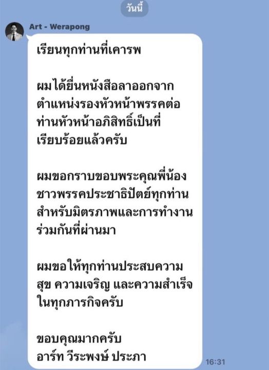 ผู้สื่อข่าวรายงานด้วยว่า นายวีระพงษ์ยังได้ส่งข้อความขอบคุณในไลน์กลุ่มของพรรคประชาธิปัตย์สำหรับมิตรภาพและการทำงานร่วมกันที่ผ่านมาด้วย