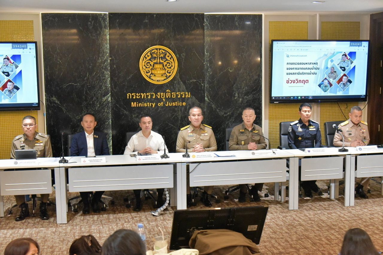 เมื่อเวลา 10.50 น. วันที่ 16 เมษายน 2569 พล.ต.ท.รุทธพล เนาวรัตน์ รัฐมนตรีว่าการกระทรวงยุติธรรม พร้อมด้วย นายเอกนัฏ พร้อมพันธุ์ รัฐมนตรีว่าการกระทรวงพลังงาน นายประเสริฐ สินสุขประเสริฐ ปลัดกระทรวงพลังงาน พล.ต.อ.ธัชชัย ปิตะนีละบุตร รองผู้บัญชาการตำรวจแห่งชาติ ในฐานะผู้อำนวยการศูนย์ต่อต้านการค้ามนุษย์ สำนักงานตำรวจแห่งชาติ (ผอ.ศตคม.ตร.) พ.ต.ต.ยุทธนา แพรดำ อธิบดีกรมสอบสวนคดีพิเศษ (ดีเอสไอ) พล.ร.อ.ธาดาวุธ ทัดพิทักษ์กุล เสนาธิการทหารเรือ เลขาธิการศูนย์อำนวยการรักษาผลประโยชน์ของชาติทางทะเล (ศรชล.) และ พล.ต.ท.นพศิลป์ พูลสวัสดิ์ ผู้บัญชาการประจำสำนักงาน ผบ.ตร. ร่วมกันแถลงข่าวปฏิบัติการเชิงรุก ขยายผลและตรวจสอบพื้นที่เป้าหมายเพื่อป้องกันและแก้ไขภาวะการขาดแคลนน้ำมันเชื้อเพลิง