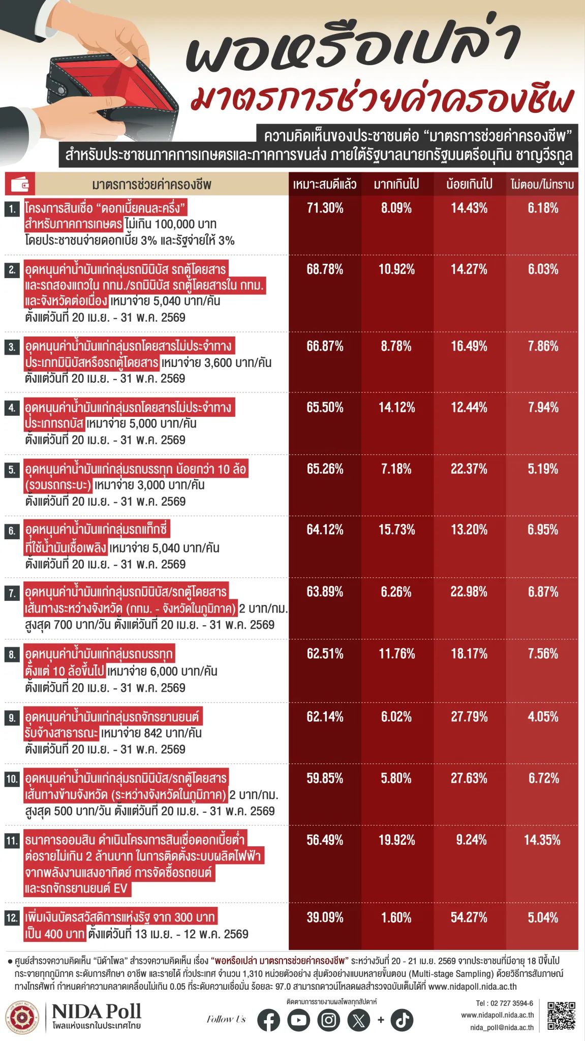 วันที่ 26 เมษายน 2569 ศูนย์สำรวจความคิดเห็น นิด้าโพล สถาบันบัณฑิตพัฒนบริหารศาสตร์ (นิด้า) เปิดเผยผลการสำรวจเรื่อง “พอหรือเปล่า มาตรการช่วยค่าครองชีพ” ทำการสำรวจระหว่างวันที่ 20-21 เมษายน 2569 จากประชาชนที่มีอายุ 18 ปีขึ้นไป กระจายทุกภูมิภาค ระดับการศึกษา อาชีพ และรายได้ ทั่วประเทศ รวมจำนวนทั้งสิ้น 1,310 หน่วยตัวอย่าง เกี่ยวกับความคิดเห็นของประชาชนต่อมาตรการช่วยค่าครองชีพของรัฐบาล จากการสำรวจเมื่อถามความคิดเห็นของประชาชนต่อ “มาตรการช่วยค่าครองชีพ” สำหรับประชาชนภาคการเกษตรและภาคการขนส่ง ภายใต้รัฐบาล นายอนุทิน ชาญวีรกูล นายกรัฐมนตรี พบว่า