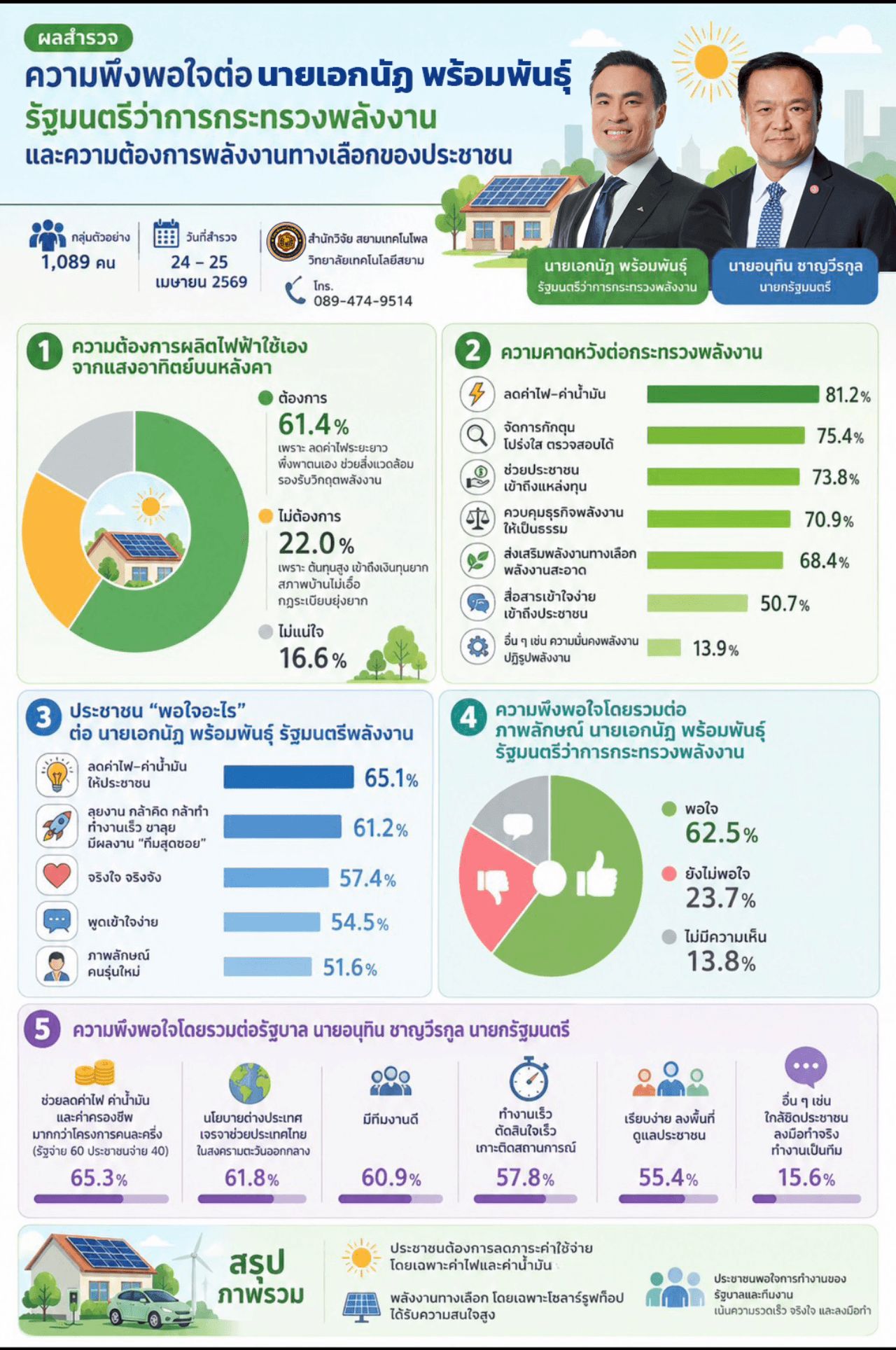 ด้านดร.ธนเสฏฐ์ อัคคัญญ์ภูดิส หัวหน้าสำนักวิจัยประจำสำนักวิจัยสยามเทคโนโพล วิทยาลัยเทคโนโลยีสยาม เปิดเผยผลสำรวจเรื่อง ความพึงพอใจต่อ นายเอกนัฏ พร้อมพันธุ์ รมว.พลังงานและความต้องการพลังงานทางเลือกของประชาชน ทำโครงการนี้ระหว่างวันที่ 24 – 25 เมษายน พ.ศ. 2569 จำนวนผู้ตอบแบบสอบถามทั้งสิ้น 1,089 หน่วยตัวอย่าง พบว่า ความคาดหวังต่อกระทรวงพลังงาน ร้อยละ 81.2 คาดหวังให้ลดค่าไฟ – ค่าน้ำมัน และร้อยละ 75.4 จัดการกักตุน โปร่งใส ตรวจสอบได้
