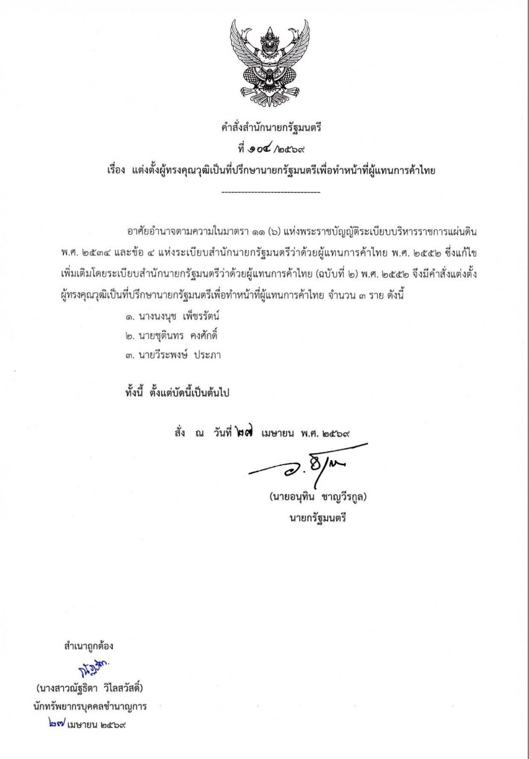 วันที่ 28 เมษายน 2569 ผู้สื่อข่าวรายงานว่า เมื่อวันที่ 27 เมษายน นายอนุทิน ชาญวีรกูล นายกรัฐมนตรีและรัฐมนตรีว่าการกระทรวงมหาดไทย ลงนามคำสั่งสำนักนายกรัฐมนตรีที่ 104/2569 เรื่อง แต่งตั้งผู้ทรงคุณวุฒิเป็นที่ปรึกษานายกรัฐมนตรีเพื่อทำหน้าที่ผู้แทนการค้าไทย อาศัยอำนาจตามความในมาตรา 11 (6 ) แห่งพระราชบัญญัติระเบียบบริหารราชการแผ่นดิน พ.ศ. 2534 และข้อ 4 แห่งระเบียบสำนักนายกรัฐมนตรีว่าด้วยผู้แทนการค้าไทย พ.ศ. 2552 ซึ่งแก้ไขเพิ่มเติมโดยระเบียบสำนักนายกรัฐมนตรีว่าด้วยผู้แทนการค้าไทย (ฉบับที่ 2) พ.ศ. 2552 จึงมีคำสั่งแต่งตั้งผู้ทรงคุณวุฒิเป็นที่ปรึกษานายกรัฐมนตรีเพื่อทำหน้าที่ผู้แทนการค้าไทย จำนวน 3 ราย ดังนี้
