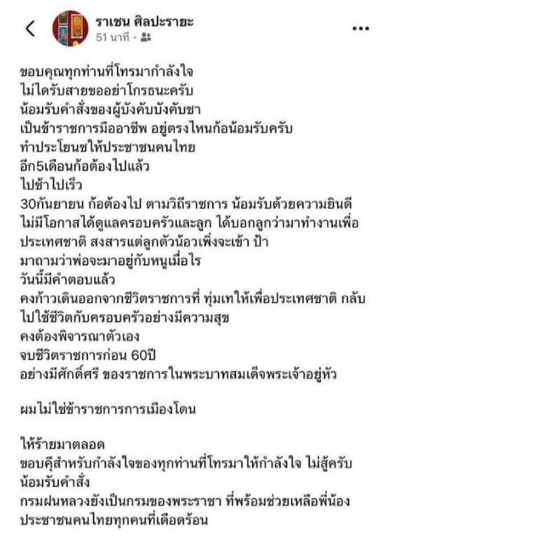 ล่าสุดนายราเชน ได้โพสต์เฟซบุ๊ก ระบุว่า “ขอบคุณทุกท่านที่โทรมากำลังใจ ไม่ได้รับสายขออย่าโกรธนะครับ น้อมรับคำสั่งของผู้บังคับบัญชา เป็นข้าราชการมืออาชีพ อยู่ตรงไหนก็น้อมรับครับ ทำประโยชน์ให้ประชาชนคนไทย อีก 5 เดือนก็ต้องไปแล้ว ไปช้าไปเร็ว 30 กันยายน ก็ต้องไป ตามวิถีราชการ น้อมรับด้วยความยินดี ไม่มีโอกาสได้ดูแลครอบครัวและลูก ได้บอกลูกว่ามาทำงานเพื่อประเทศชาติ สงสารแต่ลูก ตัวน้องเพิ่งจะเข้า ป้ามาถามว่าพ่อจะมาอยู่กับหนูเมื่อไร