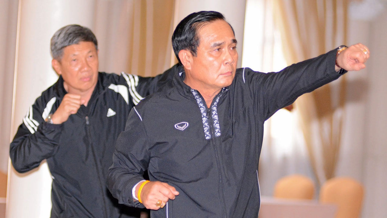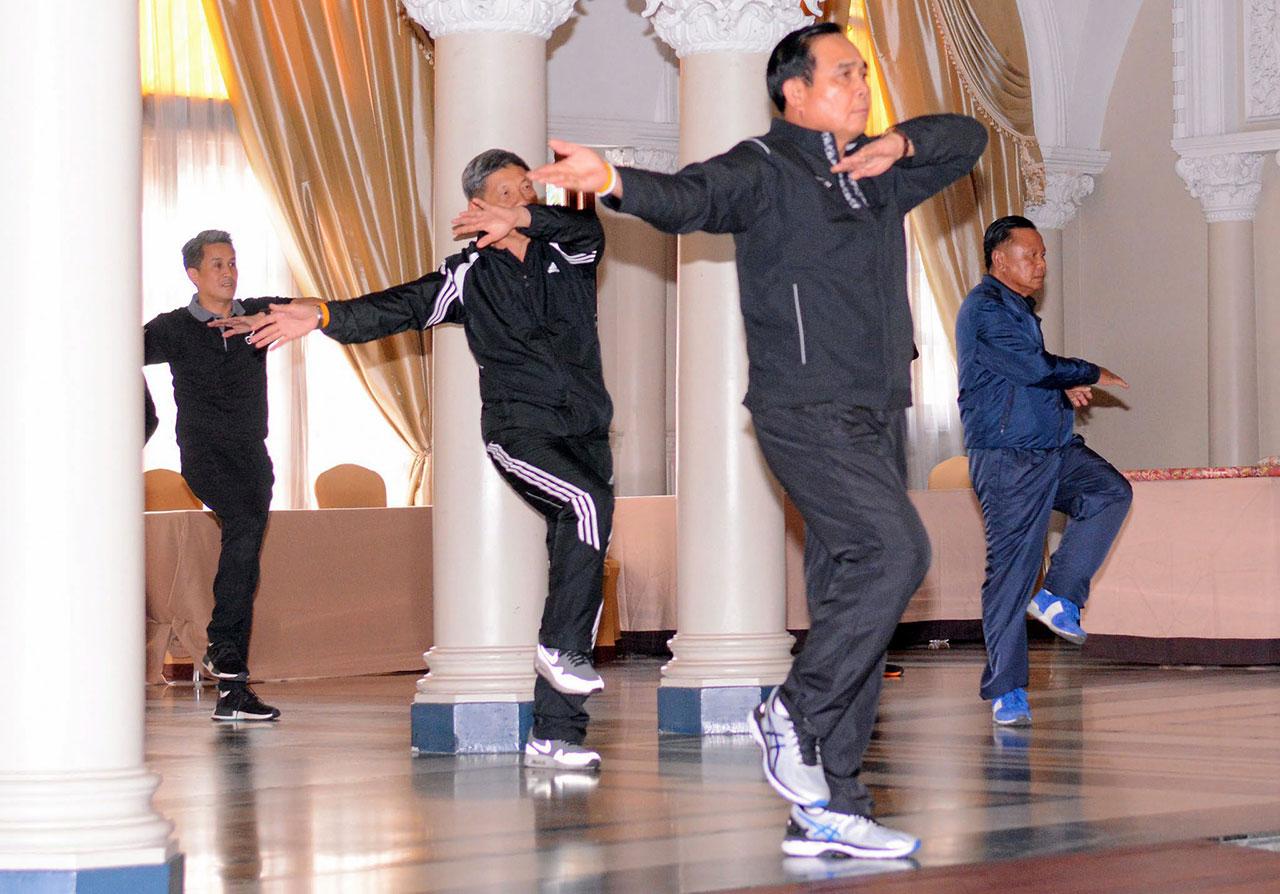 โดยนายกรัฐมนตรี ได้ร่วมเต้นแอโรบิกเพื่ออบอุ่นร่างกาย โดยมีเจ้าหน้าที่จากการกีฬาแห่งประเทศไทย (กกท.) นำออกกำลัง เป็นเวลาประมาณ 27 นาที ก่อนที่จะกลับขึ้นไปปฏิบัติภารกิจบนตึกไทยคู่ฟ้า โดยนายกรัฐมนตรีได้โบกมือให้สื่อมวลชน และไม่ได้ให้สัมภาษณ์แต่อย่างใด.