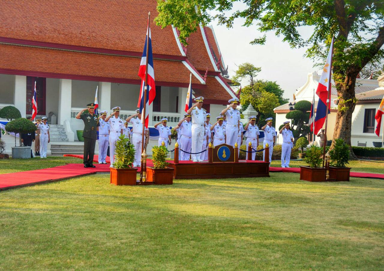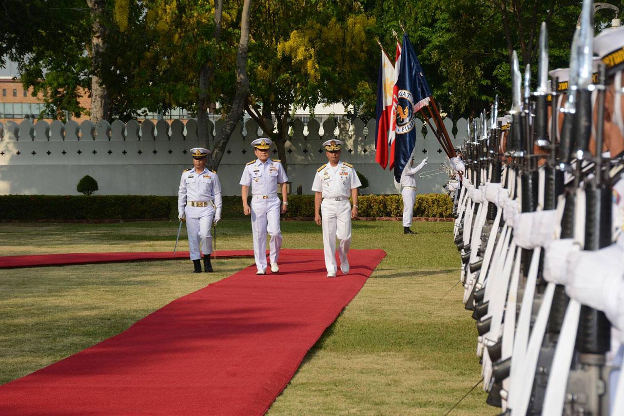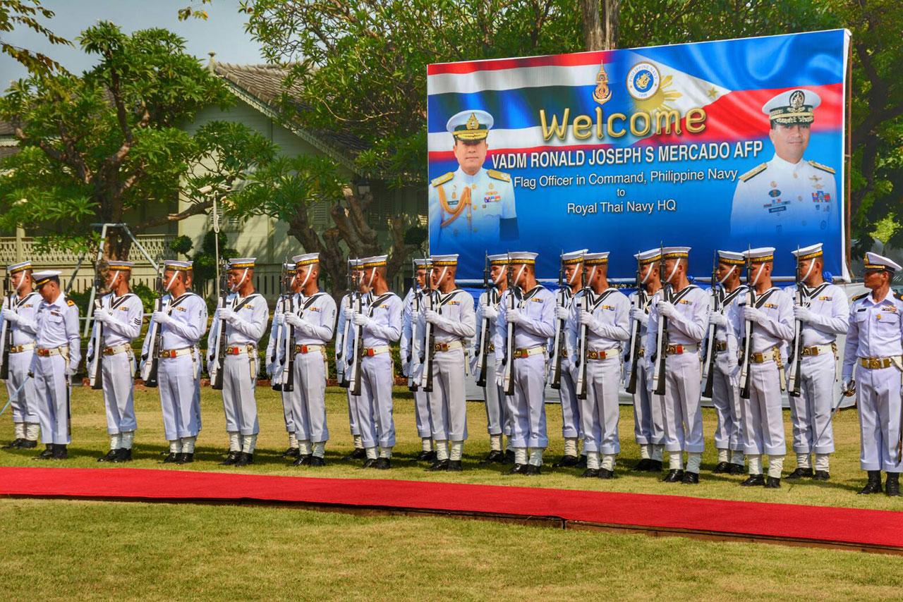 โอกาสนี้ พล.ร.ท.Ronald Joseph S Mercado AFP ผบ.ทร.สาธารณรัฐฟิลิปปินส์ ตรวจแถว และรับความเคารพจากกองทหารเกียรติยศ ณ บริเวณสนามหญ้าหน้าท้องพระโรง พระราชวังเดิม กรุงเทพมหานคร