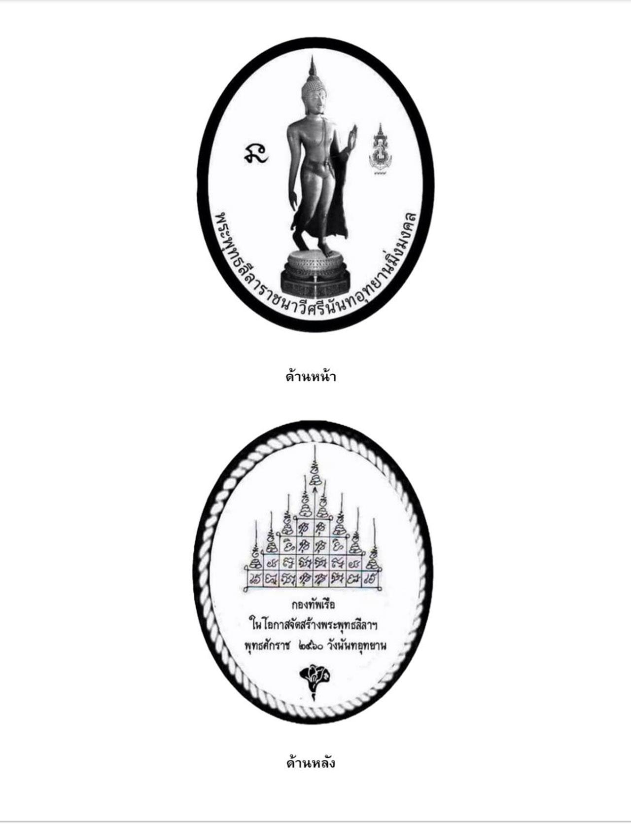 รูปแบบการสร้างพระพุทธลีลาราชนาวีฯ เป็นองค์จำลองเหมือนองค์จริง ขนาดความสูง 12 นิ้ว ลงจารึกชื่อพระนามพระลีลาฯ ด้านหน้าฐานองค์พระและกำกับจำนวน ด้านหลัง 01 – 100 และตอกโค๊ตยันต์นะ ที่ฐานพระฯ ได้อัญเชิญตรากองทัพเรือประดับที่ฐานพระฯ ด้านหลัง ปั๊มนูน ลักษณะเนื้อคือวัสดุทองเหลืองลองลูกปืนขัด แต่งลงสีเสมือนองค์จริงต้นแบบ กล่องกระดาษใส่บรรจุ ตามแบบทรงองค์พระ และเหรียญพระพุทธลีลาราชนาวีฯ เป็นเนื้อวัสดุทองเหลืองลองลูกปืน ผิวเนื้อสีทองเหลืองขัดเงา (ทองทิพย์) บรรจุใส่กล่องเหรียญแบบใสทั้งด้านหน้าและด้านหลัง และรองกำมะหยี่สีม่วง.