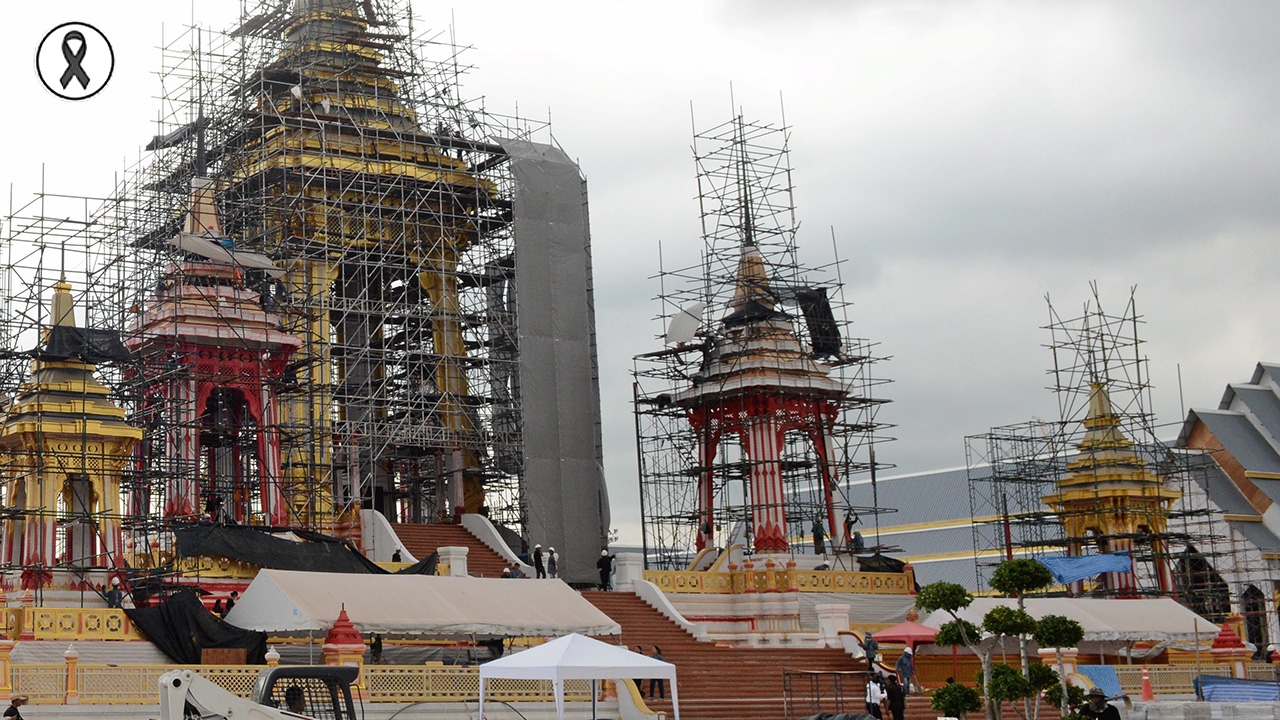 วันเดียวกัน นายก่อเกียรติ ทองผุด นายช่างศิลปกรรม สำนักสถาปัตยกรรม กรมศิลปากร เปิดเผยความคืบหน้าการสร้างพระเมรุมาศ งานพระราชพิธีถวายพระเพลิงพระบรมศพ พระบาทสมเด็จพระปรมินทร มหาภูมิพลอดุลยเดช ว่าขณะนี้ขยายแบบพระเมรุมาศเสร็จแล้ว และเริ่มประดับลายผ้าทองย่นฐานชาลาชั้นที่ 2 และชั้นที่ 3 ส่วนชั้นที่ 1 จะเริ่มประดับผ้าทองย่น เมื่อส่วนงานเขามอและสระอโนดาตแล้วเสร็จ ขณะที่แบบลายผ้าทองย่นชั้นที่ 4 ส่งผู้รับจ้างผลิตและจะเริ่มติดตั้งเร็วๆนี้ ส่วนงานฝ้า เพดาน บุษบกประธานจะติดตั้งดาวเพดานใหญ่ ประดิษฐ์เป็นรูปแบบพิเศษปิดทองประดับกระจก ซึ่งไม่เคยจัดทำมาก่อน และมีส่วนที่ใช้แขวนนพปฎล มหาเศวตฉัตรเหนือพระจิตกาธานในวันเก็บพระบรมอัฐิ และในส่วนยอดพระเมรุมาศประดับปลียอดเรียบร้อยแล้ว พร้อมติดตั้งสายล่อฟ้า ขณะที่ซ่างเริ่มติดตั้งปลียอดแล้วเช่นกัน รวมถึงการประดับซุ้มบันแถลงและชั้นเชิงกลอนต่างๆ ได้เริ่มที่บุษบกประธาน หอเปลื้อง ก่อนกระจายสู่บุษบกด้านนอก