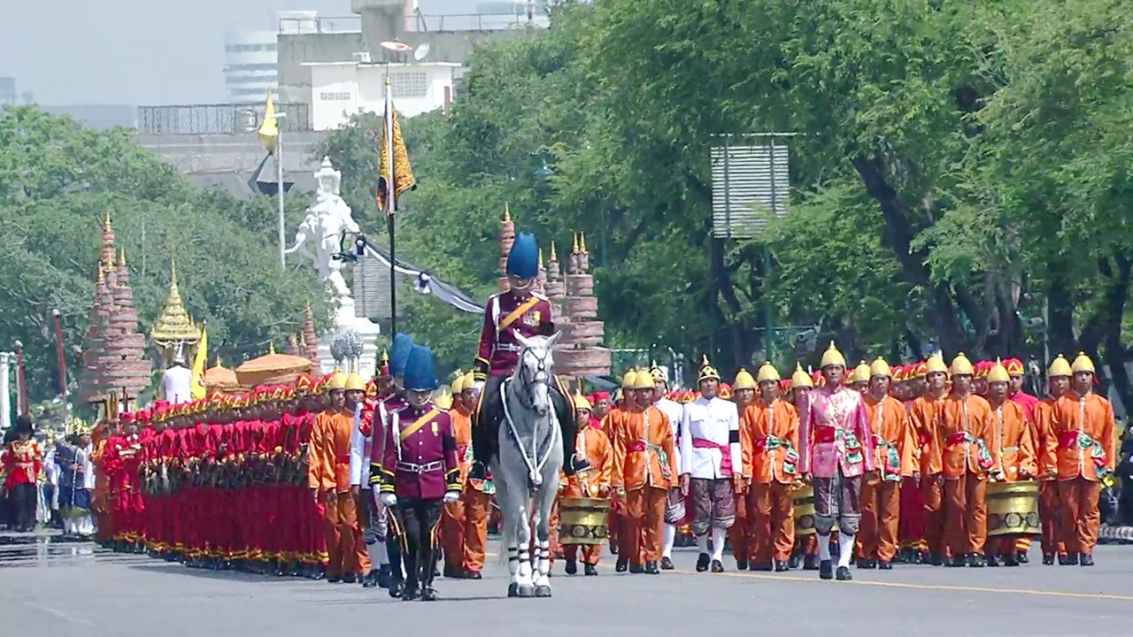 ตั้งขบวนพระบรมราชอิสริยยศ 4 สาย มีเจ้าพนักงานนําริ้ว ธง 3 ชาย นายทหารบก นายทหารเรือ นายทหารอากาศ ตํารวจหลวงถือหอก มหาดเล็กหลวง เป็นคู่แห่ ข้าราชการพลเรือนชั้นผู้ใหญ่ นายทหารราชองครักษ์เคียงพระท่ีนั่งราเชนทรยานทรงพระโกศพระบรมอัฐิ และอินทร์ พรหม ท่ีพระที่นั่งราเชนทรยานน้อยทรงพระผอบพระบรมราชสรีรางคาร มีข้าราชบริพารในพระองค์ และอินทร์ พรหม เคียงข้าง พร้อมด้วยเครื่องสูงอภิรุมชุมสายหักทองขวาง พระกลด บังพระสูรย์ พัดโบก เจ้าพนักงานภูษามาลาประคองพระโกศพระบรมอัฐิและพระบรมราชสรีรางคาร มหาดเล็กเชิญ เครื่องพระบรมราชอิสริยยศตามราชประเพณี