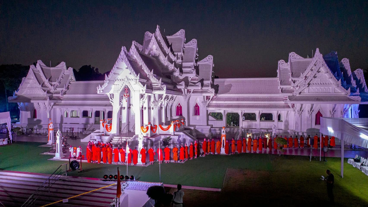 ห่างกันเพียง 1 กิโลเมตร ภายใน วัดไทยลุมพินี เนืองแน่นด้วยพระภิกษุสงฆ์ พระธรรมทูต สามเณร อุบาสก อุบาสิกา ผู้ที่เปี่ยมล้นไปด้วยพลังแห่งศรัทธาอันแรงกล้าในพระพุทธศาสนา