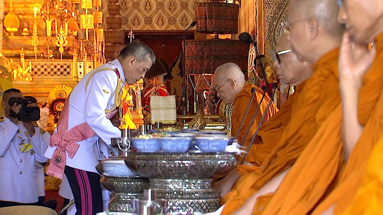 สมเด็จพระเจ้าอยู่หัว เสด็จพระราชดําเนินโดยรถยนต์พระที่นั่งจากพระที่นั่งอัมพรสถาน พระราชวังดุสิต ไปยังพระบรมมหาราชวัง จากนั้น เสด็จเข้าพระที่นั่งดุสิตมหาปราสาท ทรงจุดธูปเทียนเครื่องราชสักการะพระบรมอัฐิ พระบาทสมเด็จพระปรมินทรมหาภูมิพลอดุลยเดช บรมนาถบพิตร จากนั้นทรงจุดธูปเทียนเครื่องนมัสการบูชาพระพุทธรูปประจําพระชนมวารของ พระบาทสมเด็จพระปรมินทรมหาภูมิพลอดุลยเดช บรมนาถบพิตร ที่ประดิษฐานบนพระแท่นมหาเศวตฉัตร พระสงฆ์ 30 รูป ที่สวดพระพุทธมนต์แต่วันก่อนถวายพรพระ สมเด็จพระเจ้าอยู่หัว ทรงประเคนภัตตาหาร พระสงฆ์รับพระราชทานฉัน เสร็จแล้ว ทรงประเคนจตุปัจจัยไทยธรรม พระสงฆ์ถวายอนุโมทนา ถวายอดิเรก ถวายพระพรลา