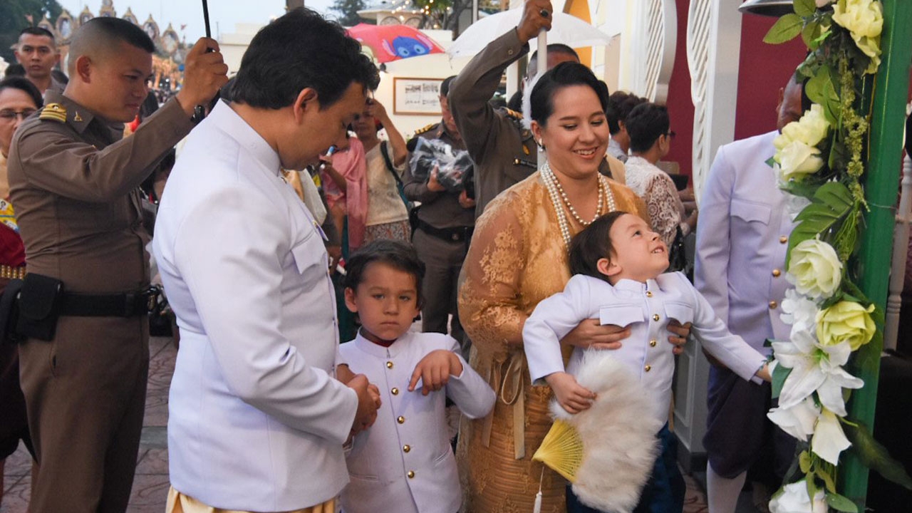 คุณพลอยไพลิน เจนเซน พระธิดาองค์โตใน ทูลกระหม่อมหญิง อุบลรัตนราชกัญญา สิริวัฒนาพรรณวดี พร้อมด้วยนายเดวิด วีลเลอร์ สามีและลูกชายทั้งสองคน แต่งชุดไทย เข้าเยี่ยมชมงานอุ่นไอรัก คลายความหนาว ที่พระลานพระราชวังดุสิต.