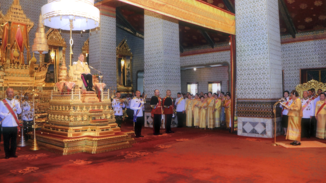 เมื่อพระบาทสมเด็จพระเจ้าอยู่หัว เสด็จขึ้นประทับบนพระที่นั่งพุดตาน กาญจนสิงหาสน์ภายใต้นพปฎลมหาเศวตฉัตร เจ้าพนักงานรัวกรับและเปิดพระวิสูตร ชาวพนักงานประโคมกระทั่ง แตร มโหระทึก ทหารกองเกียรติยศถวายความเคารพ วงดุริยางค์บรรเลงเพลงสรรเสริญพระบารมี