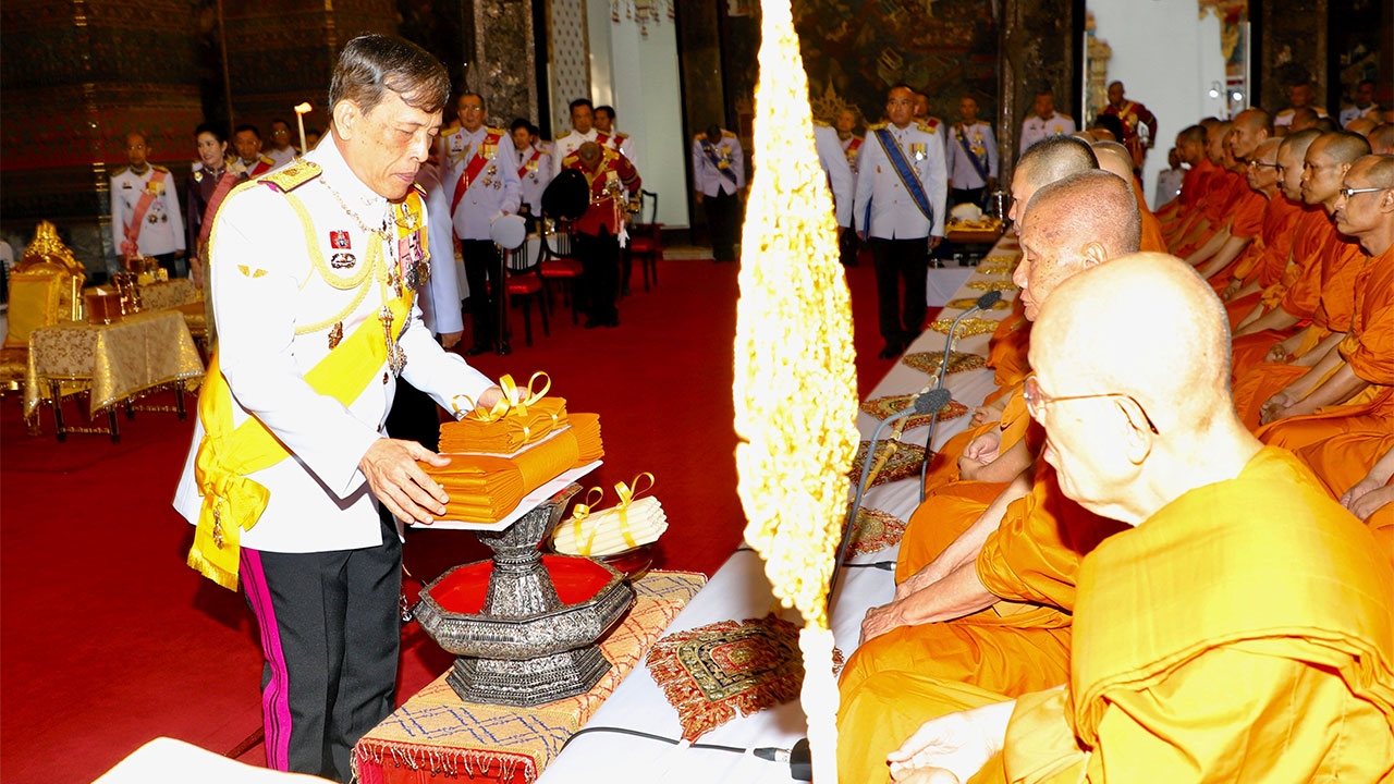 ครั้นเสด็จเข้าพระอุโบสถ พระบาทสมเด็จ พระเจ้าอยู่หัว ทรงรับผ้าไตรจากเจ้าพนักงานศุภรัต ทรงวางผ้าไตรเหนือพานแว่นฟ้า โอกาสนี้ทรงพระสุหร่าย ทรงเจิมสังวาลนพรัตน์ จากนั้นเสด็จขึ้นเกย ด้านฝั่งขวาพระพุทธอังคีรส พระประธานพระอุโบสถ โดย พล.อ.ต.สุพิชัย สุนทรบุระ รองเลขาธิการพระราชวัง ปฏิบัติหน้าที่เจ้าพนักงานภูษามาลา เชิญสังวาลนพรัตน์ นำเสด็จ จากนั้น เชิญสังวาลนพรัตน์พาดพระอังสาซ้ายเฉียงลงทางขวาพระพุทธอังคีรส พระประธานอุโบสถ การนี้ พระบาทสมเด็จพระเจ้าอยู่หัว ทรงเกี่ยวตะขอสังวาลนพรัตน์ที่พระปฤษฎางค์พระพุทธอังคีรส พระประธานพระอุโบสถ เพื่อถวายเป็นพุทธบูชา เสด็จลงจากเกย ทรงจุดธูปเทียนเครื่องนมัสการบูชาพระพุทธอังคีรส พระประธานพระอุโบสถ แล้วทรงจุดธูปเทียนเครื่องทองน้อย ถวายราชสักการะพระบรมราชสรีรางคารรัชกาลที่ 7 กับพระราชสรีรางคาร สมเด็จพระนางเจ้ารำไพพรรณี พระบรมราชินี ในรัชกาลที่ 7 และพระบรมราชสรีรางคาร รัชกาลที่ 9 จากนั้น ทรงหยิบผ้าห่มสำหรับพระประธานที่วางอยู่บนหลังผ้าไตร พระราชทานเจ้าพนักงานภูษามาลา ทรงหยิบผ้าไตรที่พานแว่นฟ้านั้นพาดระหว่างพระกร แล้วประนมพระหัตถ์ผินพระพักตร์สู่พระประธาน ทรงว่า “นะโม ตัสสะฯ” จบ 3 หนแล้ว ผินพระพักตร์สู่ที่ชุมนุมสงฆ์ กล่าวคำถวายผ้าพระกฐิน ทรงประเคนผ้าไตรและเทียนปาฏิโมกข์แด่พระสงฆ์รูปที่ 2 พระสงฆ์ ทำพิธีกฐินกรรม