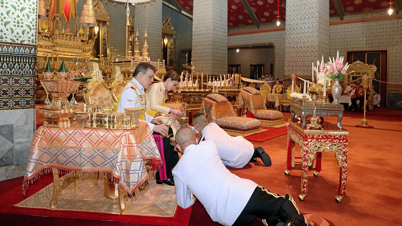เมื่อเสด็จเข้าพระที่นั่งอมรินทรวินิจฉัยทรงจุดธูปเทียนเครื่องนมัสการพานทองสองชั้นบูชาพระพุทธ ปฏิมาชัยวัฒน์ รัชกาลที่ 9 พระพุทธมหาราชฉปริวัตน์ และพระพุทธรูปประจำพระชนมวารของพระบาทสมเด็จพระบรมชนกาธิเบศร มหาภูมิพล อดุลยเดชมหาราช บรมนาถบพิตร พระพุทธรูปประจำ พระชนมวารของพระบาทสมเด็จพระปรเมนทร มหาอานันทมหิดล พระอัฐมรามาธิบดินทร พระพุทธรูป ประจำพระชนมวารของสมเด็จพระมหิตลาธิเบศร อดุลยเดชวิกรม พระบรมราชชนก พระพุทธรูปประจำ พระชนมวารของสมเด็จพระศรีนครินทราบรม ราชชนนี และพระพุทธรูปประจำพระชนมวารสมเด็จ พระเจ้าพี่นางเธอ เจ้าฟ้ากัลยาณิวัฒนา กรมหลวง นราธิวาสราชนครินทร์ ที่หน้าพระที่นั่งบุษบกมาลา