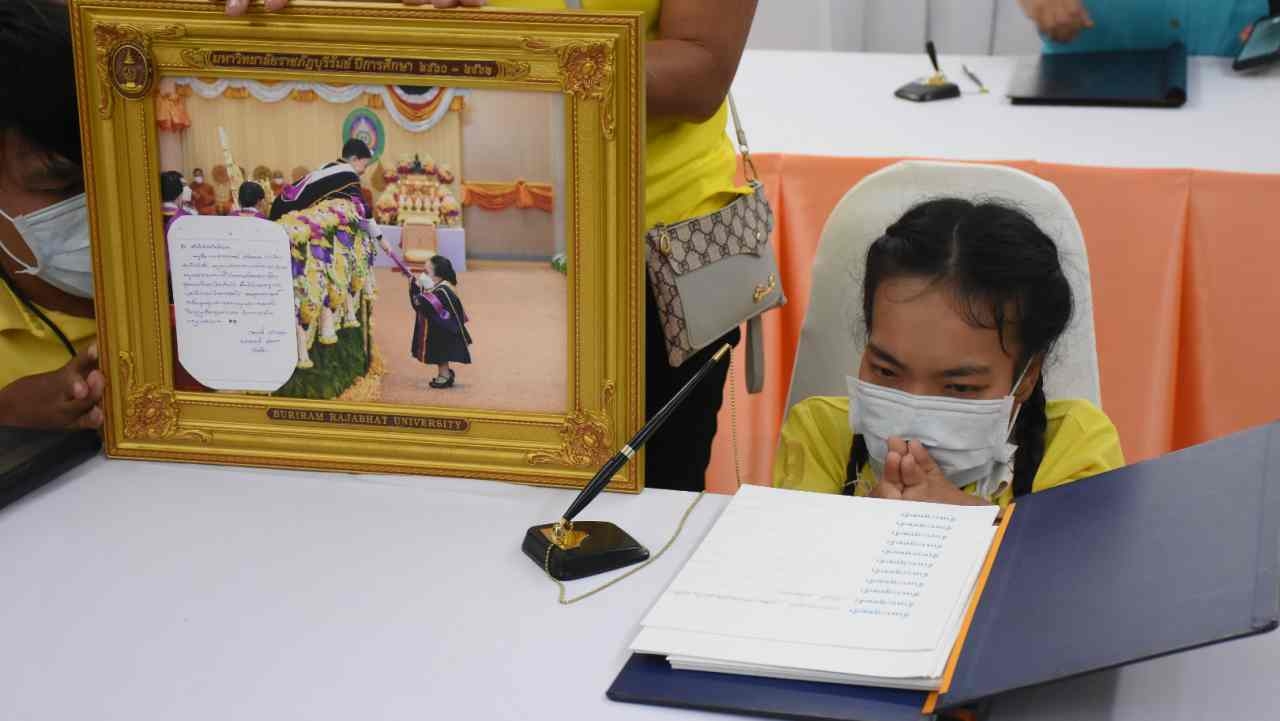 "น้องหมิว" บัณฑิตร่างจิ๋วสูง 92 ซม. ถือภาพที่ "พระองค์ภา" โน้มพระวรกาย พระราชทานปริญญาบัตรให้ มาร่วมลงนามถวายพระพร พร้อมเขียนจดหมายด้วยลายมือ ขอให้ทรงมีพระพลานามัยแข็งแรงโดยเร็ววัน