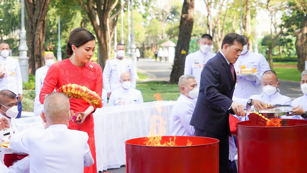 พระบาทสมเด็จพระเจ้าอยู่หัว และ สมเด็จพระนางเจ้าฯ พระบรมราชินี เสด็จออก ณ บริเวณด้านหน้าพระที่นั่งอัมพรสถาน พระราชวังดุสิต ทรงประกอบพิธีสังเวยพระป้ายและทรงเผากระดาษเงินกระดาษทอง เมื่อวันที่ 22 มกราคม เนื่องในเทศกาลตรุษจีน พุทธศักราช 2566.