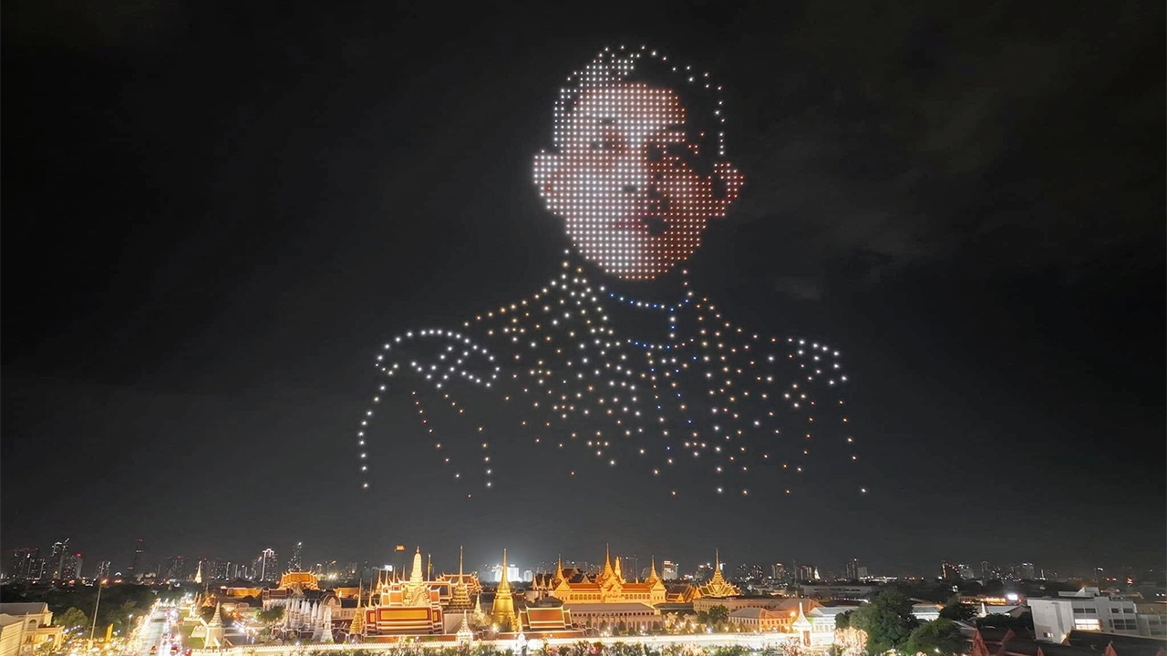 การแสดงโดรน 1,200 ลำ แปรขบวนเป็นพระบรมฉายาลักษณ์ พระบาทสมเด็จพระเจ้าอยู่หัว งดงามกลางท้องฟ้าเหนือพระบรมมหาราชวัง ในงานมหรสพสมโภชเฉลิมพระเกียรติ พระบาทสมเด็จพระเจ้าอยู่หัว เนื่องในโอกาสพระราชพิธีมหามงคลเฉลิม พระชนมพรรษา 6 รอบ 28 ก.ค.2567 ที่ท้องสนามหลวง สร้างความประทับใจ และปลื้มปีติแก่ผู้ชมงาน.