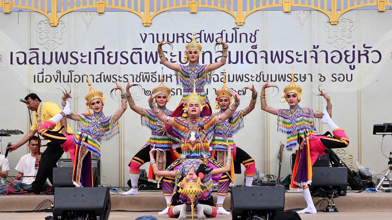 การแสดงโนราชุด “โนราสู่ภูมิปัญญาเทิดไท้องค์ราชัน” ที่สวยงาม บนเวทีย่อยกลางสนามหลวง ในงานมหรสพสมโภช เฉลิม พระเกียรติ พระบาทสมเด็จพระเจ้าอยู่หัว เมื่อเย็นวันที่ 12 ก.ค. โดยในงานมีประชาชนจำนวนมากเดินทางไปชมริ้วขบวนรถเฉลิมพระเกียรติและชมนิทรรศการต่างๆตั้งแต่ช่วงเที่ยง.