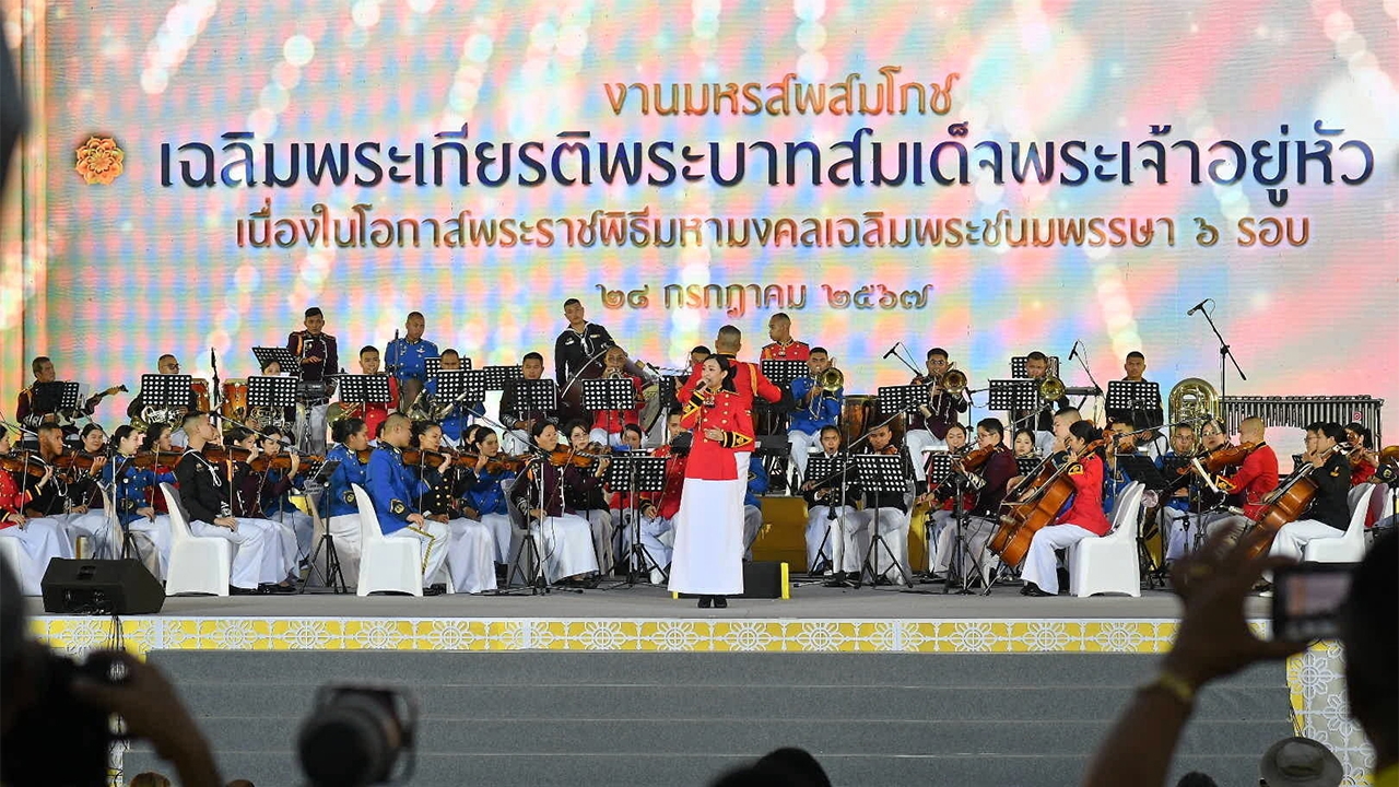 ขณะที่บรรยากาศงานมหรสพสมโภชเฉลิมพระเกียรติฯ ที่ท้องสนามหลวง เมื่อวันที่ 14 ก.ค. เวทีใหญ่ เริ่มขึ้นในเวลา 18.30 น. ด้วยการแสดง ดนตรี “มหาดุริยางค์ 4 เหล่าทัพ” เป็นการแสดง ร่วมกันของกองทัพบก กองทัพอากาศ กองทัพเรือ และสำนักงานตำรวจแห่งชาติ เสียงดังกังวานก้องท้องสนามหลวง จากนั้นเป็นการแสดงดนตรี