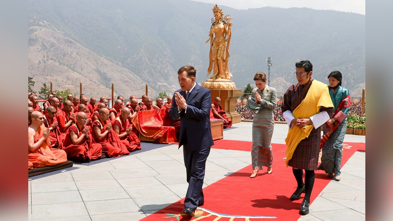พระบาทสมเด็จพระเจ้าอยู่หัว และ สมเด็จพระนางเจ้าฯ พระบรมราชินี เสด็จฯพร้อม สมเด็จพระราชาธิบดี และ สมเด็จพระราชินีแห่งภูฏาน ทรงร่วมพิธีเจริญพระพุทธมนต์ถวายพระพรชัยมงคล โดย คณะสงฆ์ภูฏานและคณะสงฆ์ไทย ณ สถานที่ประดิษฐานพระพุทธรูป ดอร์เดนมา ประเทศภูฏาน.