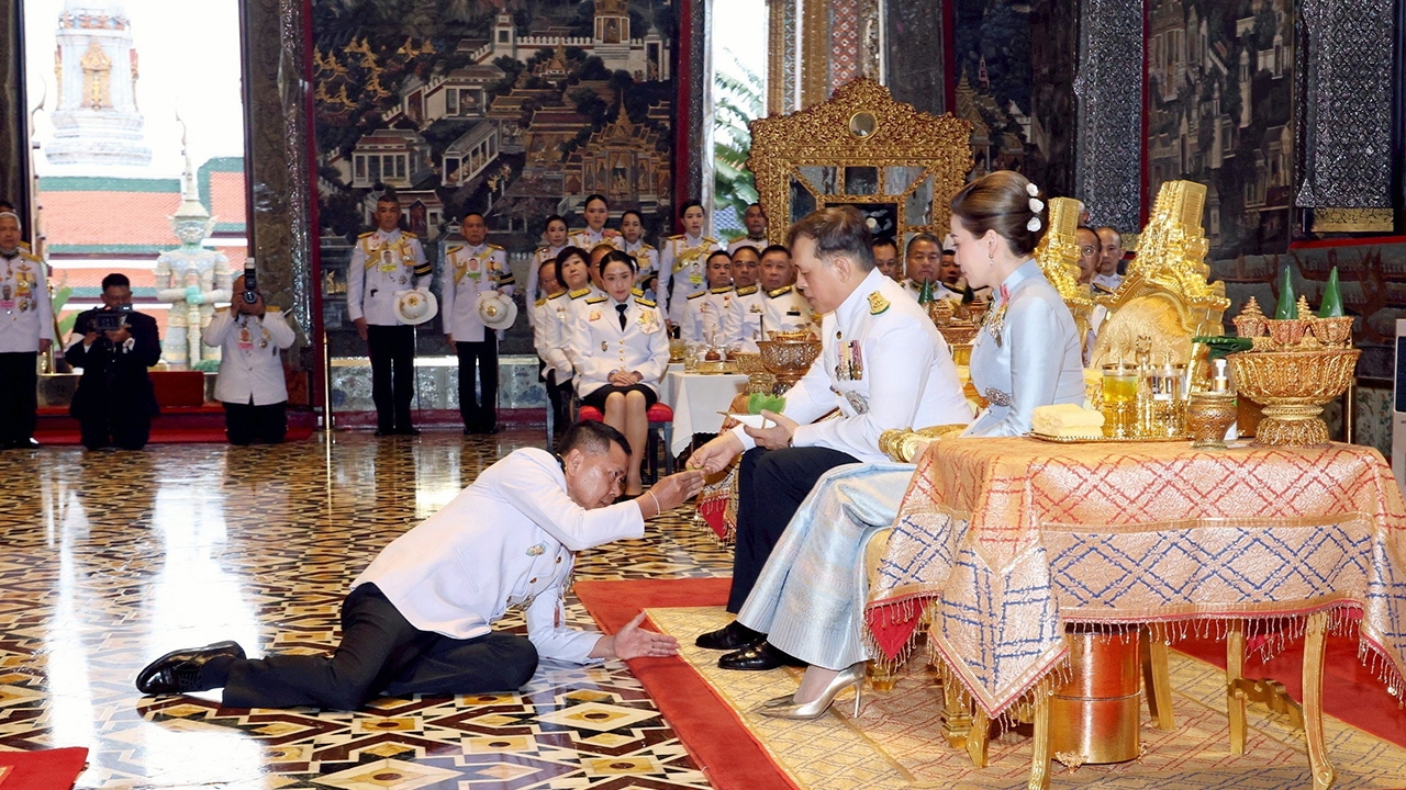 พระบาทสมเด็จพระเจ้าอยู่หัว และ สมเด็จพระนางเจ้าฯ พระบรมราชินี เสด็จฯไปในการพระราชพิธีพืชมงคล ปี 2568 ณ พระอุโบสถวัดพระศรีรัตนศาสดาราม ในพระบรมมหาราชวัง ทรงหลั่งน้ำสังข์ ทรงเจิม นายประยูร อินสกุล ปลัดกระทรวงเกษตรฯ ผู้ทำหน้าที่พระยาแรกนาในพระราชพิธีจรดพระนังคัลแรกนาขวัญ.