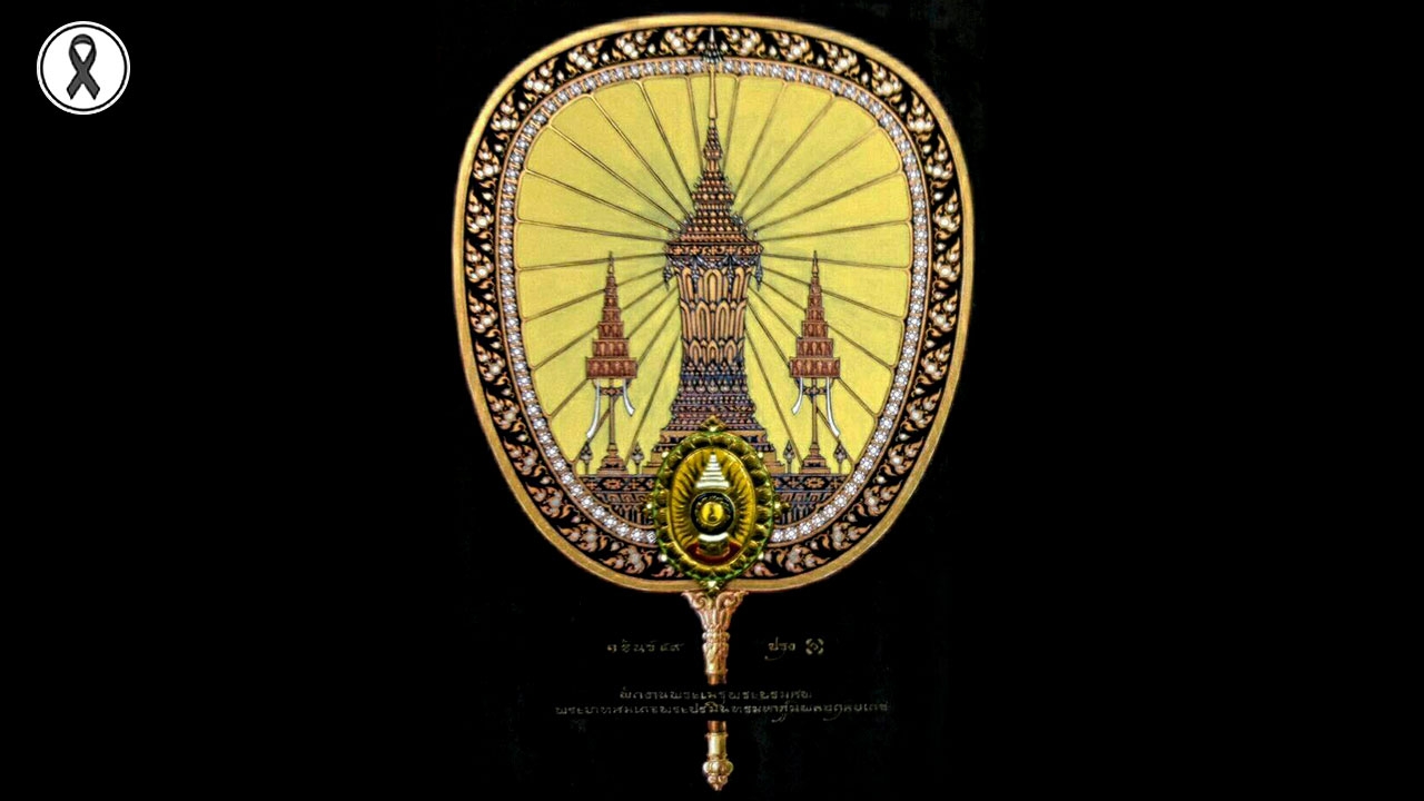 ภาพพัดรองงานฉลองพระบรมอัฐิ ที่ใช้ในงานพระราชพิธีถวายพระเพลิงพระบรมศพพระบาท สมเด็จพระปรมินทรมหาภูมิพลอดุลยเดช ที่ออกแบบโดยจิตรกรชำนาญการ กลุ่มจิตรกรรม ของสำนักช่างสิบหมู่.