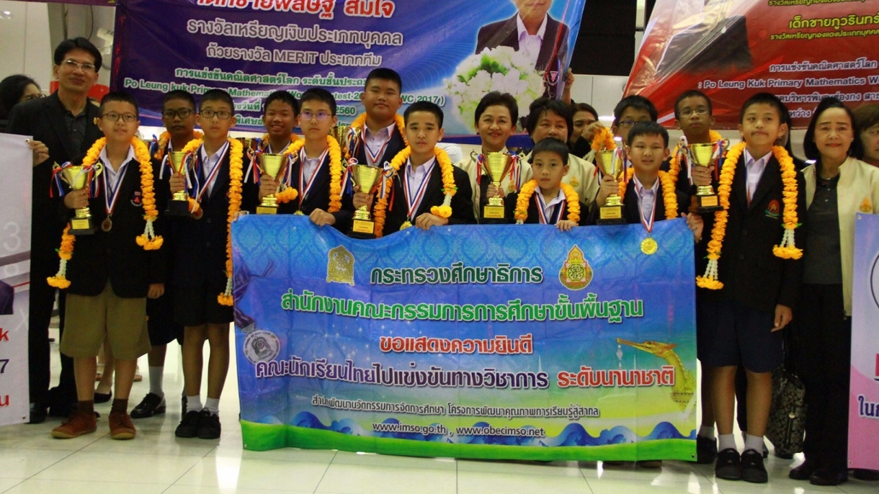 เมื่อเวลา 22.00น.วันที่ 20 ก.ค.60 นางสุจิตรา พัฒนะภูมิ รองเลขาธิการคณะกรรมการการศึกษาขั้นพื้นฐาน ได้นำทีมคณะนักเรียนระดับประถมศึกษาของไทยที่ เข้าร่วมการแข่งขันคณิตศาสตร์โลก ระดับประถมศึกษา : Po Leung Kuk Primary Mathematics World Contest 2017 (PMWC 2017) ระหว่างวันที่ 15-20 กรกฎาคม 2560 ณ เขตบริหารพิเศษฮ่องกง สาธารณรัฐประชาชนจีน และสามารถคว้ารางวัลได้ถึง 19 รางวัล รวม 34 เหรียญ เดินทางกลับถึงท่าอากาศยานสุวรรณภูมิด้วยสายการบินไทย เที่ยวบินที่ TG 639 เวลา 21.10 น. ท่ามกลางการต้อนรับอย่างอบอุ่นของบรรดาผู้ปกครอง และคณะครูอาจารย์ของนักเรียนที่ได้รับรางวัล