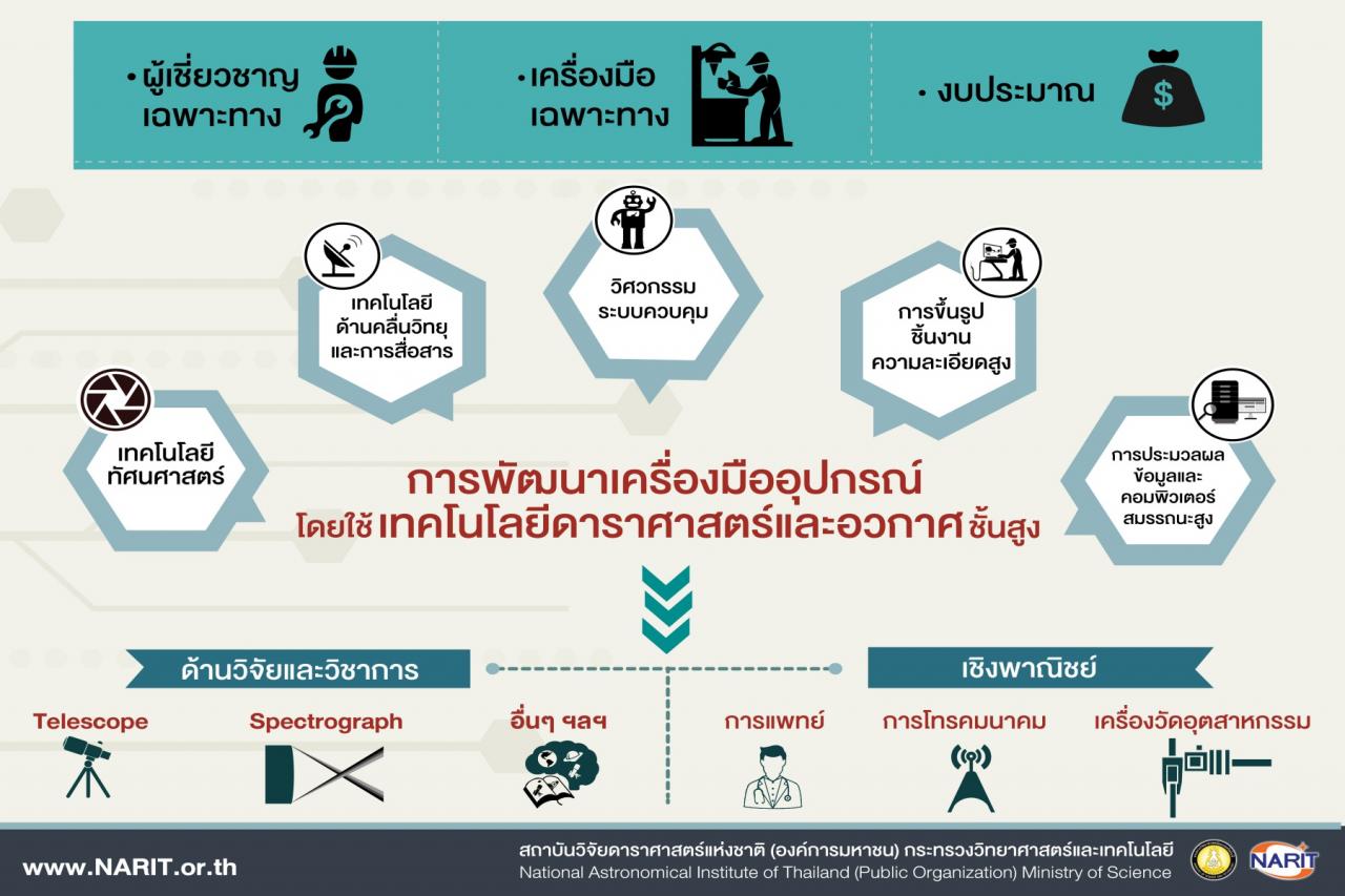 ดร.ศรัณย์ โปษยะจินดา ผู้อำนวยการสถาบันวิจัยดาราศาสตร์แห่งชาติ (องค์การมหาชน) กระทรวงวิทยาศาสตร์และเทคโนโลยี หรือ สดร. เปิดเผยว่า การศึกษาวิจัยทางดาราศาสตร์ทั้งในปัจจุบันและในอนาคต ต้องอาศัยเทคโนโลยี เครื่องมือ อุปกรณ์ที่มีประสิทธิภาพสูง ทันสมัย ได้ข้อมูลที่แม่นยำ และรวดเร็ว จำเป็นต้องมีการพัฒนาเทคโนโลยีขั้นสูงในหลายๆ ด้าน เพื่อรองรับการศึกษาวิจัยด้านดาราศาสตร์ ที่จะสามารถ ต่อยอดไปสู่การผลิตในอุตสาหกรรมขั้นสูงของประเทศต่อไปในอนาคต อาทิ เทคโนโลยีทางเครื่องมือวิทยาศาสตร์และอุตสาหกรรมขั้นสูง เทคโนโลยีการขึ้นรูปที่ละเอียดแม่นยำ เทคโนโลยีด้านโรโบติกส์ เทคโนโลยีวัสดุ เทคโนโลยีการรับ-ส่งข้อมูล การประมวลผลข้อมูลที่มีขนาดใหญ่ ฯลฯ สดร.มีเป้าหมายจะพัฒนาเทคโนโลยีขั้นสูงเหล่านี้ ร่วมกับเครือข่ายทั้งภาครัฐและเอกชน ภายในและต่างประเทศ ก่อให้เกิดการผลิตและพัฒนากำลังคนด้านเทคโนโลยีขั้นสูงในสาขาที่เกี่ยวข้อง สู่ภาคอุตสาหกรรม รวมถึงการใช้ประโยชน์เชิงพาณิชย์จากเทคโนโลยีและนวัตกรรมเหล่านี้ต่อไปในอนาคต