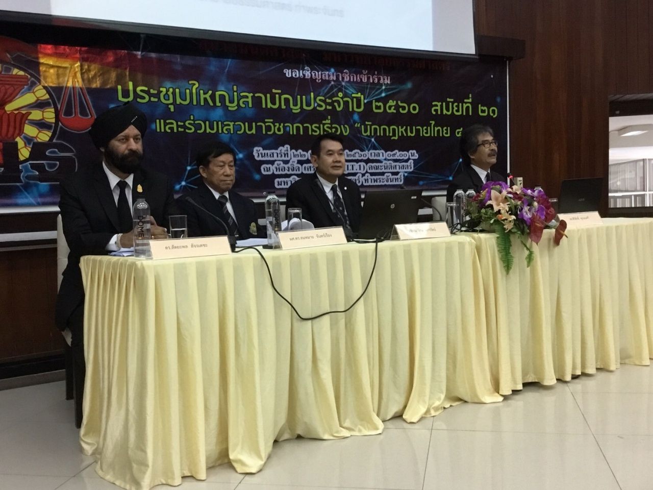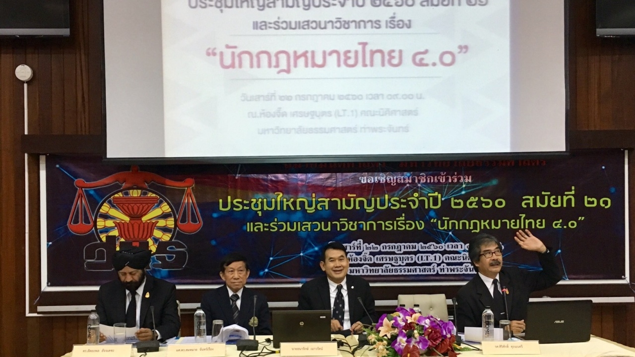 ผู้สื่อข่าวรายงานว่า เมื่อวันที่ 22 ก.ค. 2560 ที่ห้องประชุมจี๊ด เศรษฐบุตร คณะนิติศาสตร์ ม.ธรรมศาสตร์ ศูนย์ท่าพระจันทร์ สมาคมนิติศาสตร์ ม.ธรรมศาสตร์ จัดประชุมใหญ่สามัญประจำปี 2560 สมัยที่ 21 และงานเสวนาเรื่อง ‘นักกฎหมายไทย 4.0 โดยมี ผศ.ดร.สมหมาย จันทร์เรือง คณบดีคณะนิติศาสตร์ ม.สยาม นายธนารักษ์ เนาวรัตน์ ผู้พิพากษาหัวหน้าศาลประจำสำนักประธานศาลฎีกา นายสัตยะพล สัจจเดชะ อาจารย์พิเศษคณะนิติศาสตร์ ม.ธรรมศาสตร์ เป็นผู้ร่วมเสวนา มี รศ.ศิริศักดิ์ ศุภมนตรี เป็นผู้ดำเนินรายการ