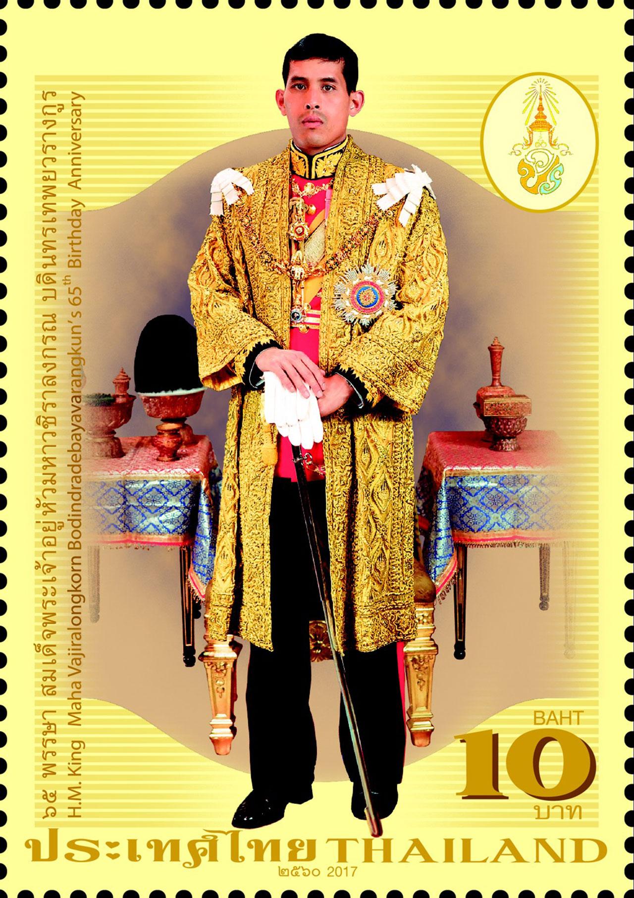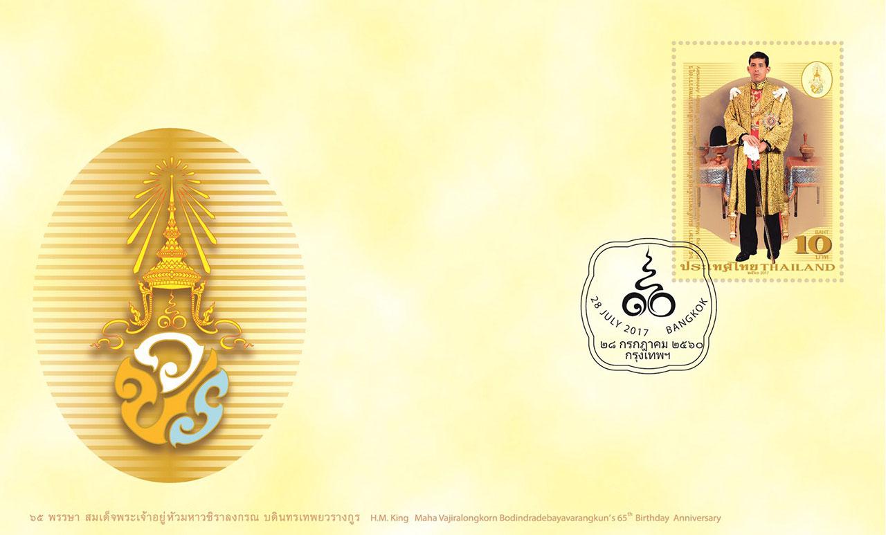 เมื่อวันที่ 28 ก.ค. 60 บริษัท ไปรษณีย์ไทย จำกัด (ปณท) เปิดจำหน่ายตราไปรษณียากรที่ระลึก 65 พรรษา สมเด็จพระเจ้าอยู่หัวมหาวชิราลงกรณ บดินทรเทพยวรางกูร เป็นแสตมป์ชุดแรกแห่งรัชกาลที่ 10 นำเสนอภาพพระฉายาลักษณ์พระราชทานในฉลองพระองค์ครุยมหาจักรีบรมราชวงศ์ ประกอบอักษรพระปรมาภิไธย ว.ป.ร. พร้อมข้อความบรรยาย บนพื้นภาพสีเหลือง ซึ่งเป็นสีประจำวันพระราชสมภพ เพิ่มเทคนิคปั๊มฟอยล์ทองบริเวณคำบรรยาย ชื่อชุด ชนิดราคา และประเทศไทย ในราคาดวงละ 10 บาท (เต็มแผ่น 10 ดวง) และซอง วันแรกจำหน่ายราคา 20 บาท