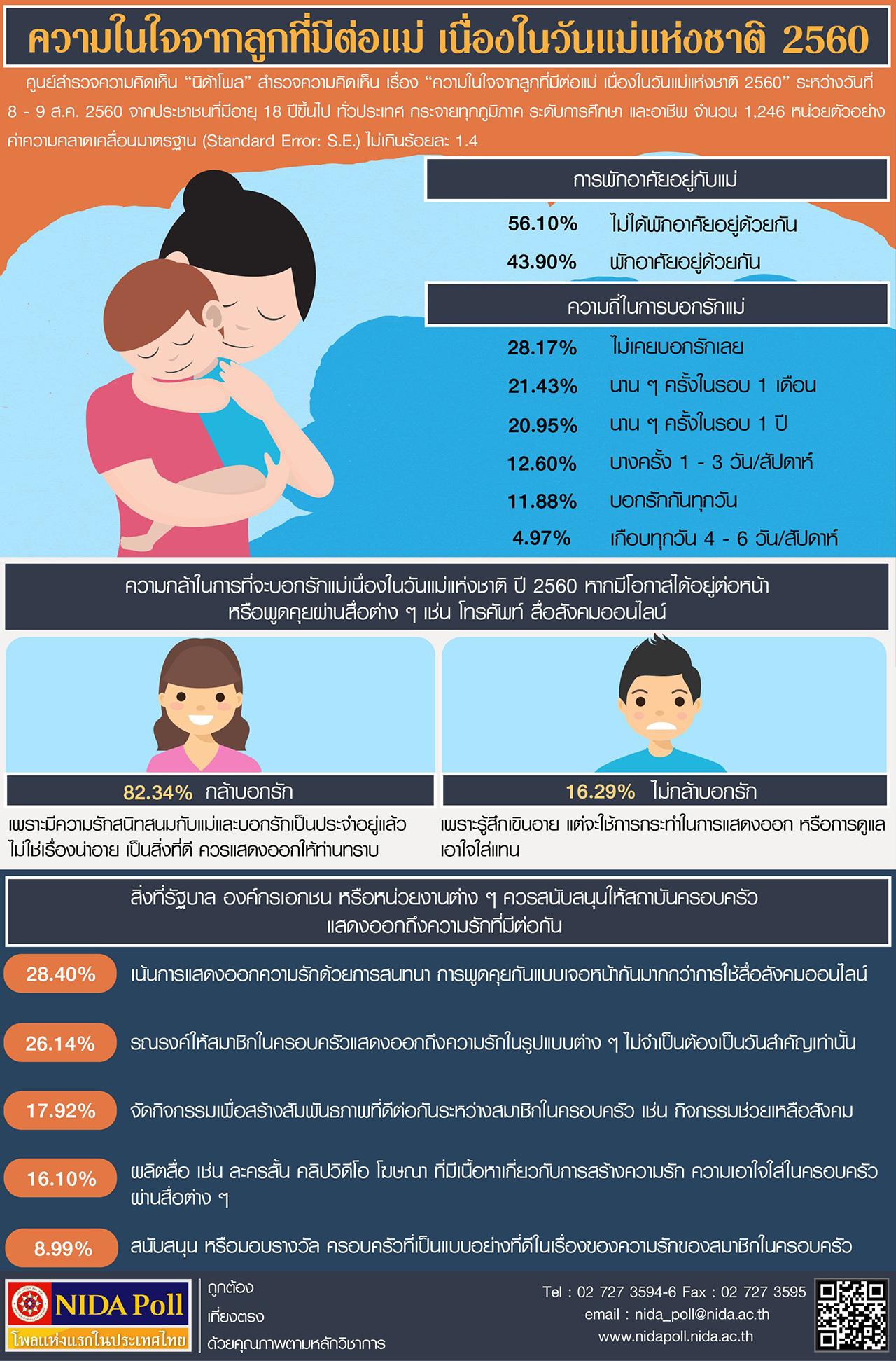 เมื่อวันที่ 11 ส.ค. ศูนย์สำรวจความคิดเห็น “นิด้าโพล” สถาบันบัณฑิตพัฒนบริหารศาสตร์ (นิด้า) เปิดเผยผลสำรวจความคิดเห็นของประชาชน เรื่อง “ความในใจจากลูกที่มีต่อแม่ เนื่องในวันแม่แห่งชาติ 2560” จากประชาชนที่มีอายุ 18 ปี ขึ้นไปทั่วประเทศ กระจาย ทุกภูมิภาค ระดับการศึกษา และอาชีพ รวมทั้งสิ้น จำนวน 1,246 หน่วยตัวอย่าง โดยเมื่อถามการพักอาศัยอยู่กับคุณแม่ในปัจจุบัน พบว่า ประชาชน ส่วนใหญ่ ร้อยละ 56.10 ระบุว่า ไม่ได้พักอาศัยอยู่ด้วยกัน และร้อยละ 43.90 ระบุว่า พักอาศัยอยู่ด้วยกัน