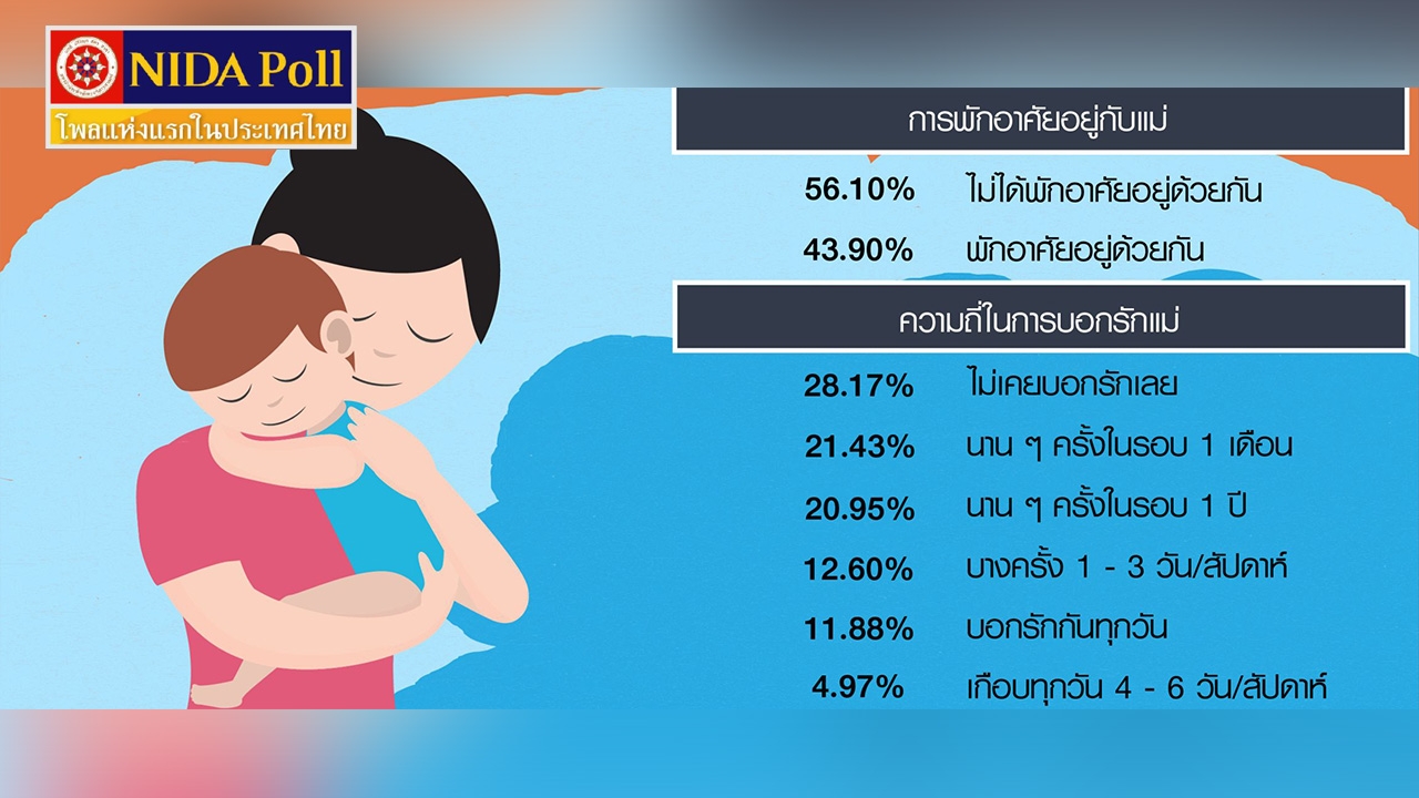 นิด้าโพล เผย คนส่วนใหญ่ 82.34% กล้าบอกรักแม่ในวันแม่ ชี้เป็นสิ่งไม่น่าอายต่อผู้ให้กำเนิด ขณะที่ 56.10% ระบุ ไม่ได้อยู่กับแม่ และ 16.29% บอกไม่กล้าบอกรัก เพราะอาย แต่จะซื้อของไปฝาก พาไปทานข้าว ดูแลเอาใจใส่มากกว่าคำพูด...
