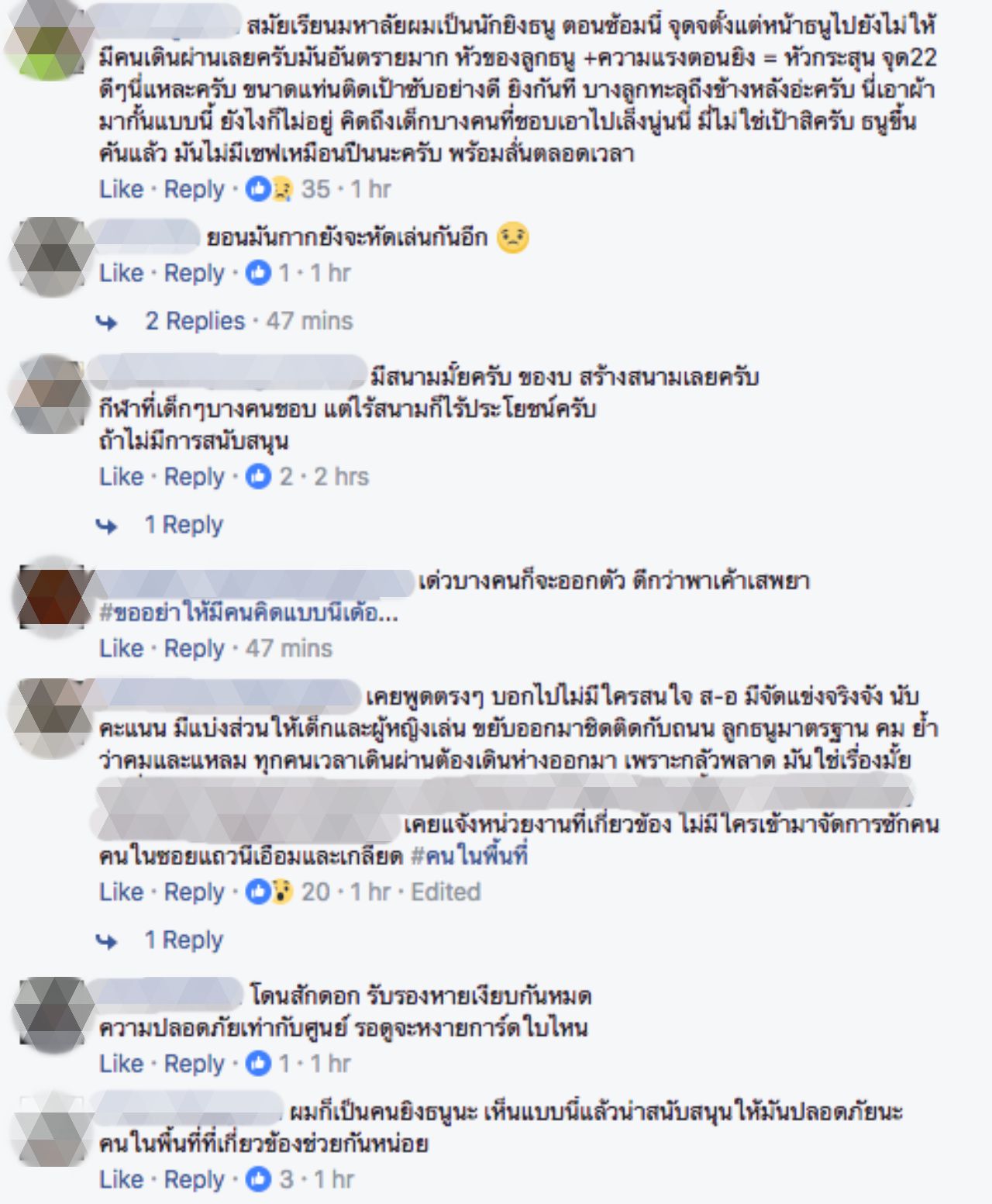 อย่างไรก็ตาม หลังคลิปนี้เผยแพร่ออกมา ก็มีผู้ใช้สื่อโซเชียลมาคอมเมนต์ในลักษณะต่างๆ บ้างก็ว่าดีที่สนับสนุนกีฬา แต่ต้องหาสถานที่ที่ปลอดภัยด้วย บางรายเคยเป็นนักยิงธนูบอกว่า “หัวของลูกธนู + ความแรงตอนยิง = หัวกระสุน จุด22 ดีๆ นี่แหละ ธนูขึ้นคันแล้ว มันไม่มีเซฟเหมือนปืน พร้อมลั่นตลอดเวลา”